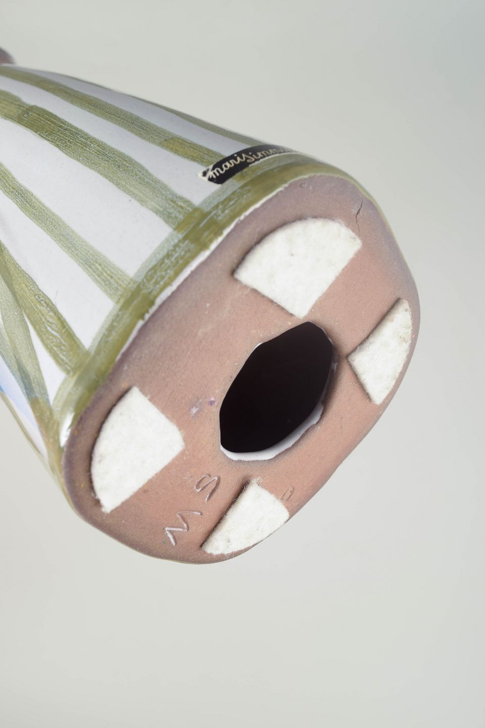 Stor håndmalet keramikfigur af en stående kvinde i brunstribet bluse og grøn-hvidstribet nederdel med gult bælte. Et karakteristisk arbejde af Mari Simmulson med hendes enkle, stiliserede formsprog og rolige udtryk.