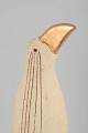 Elegant fugleformet skulptur i håndformet stentøj med lys, let ru overflade og indgraverede linjer, monteret på metalben med base i jern. Næbbet i metallisk glasur skaber en markant kontrast til den matte krop. Signeret af kunstneren.