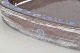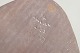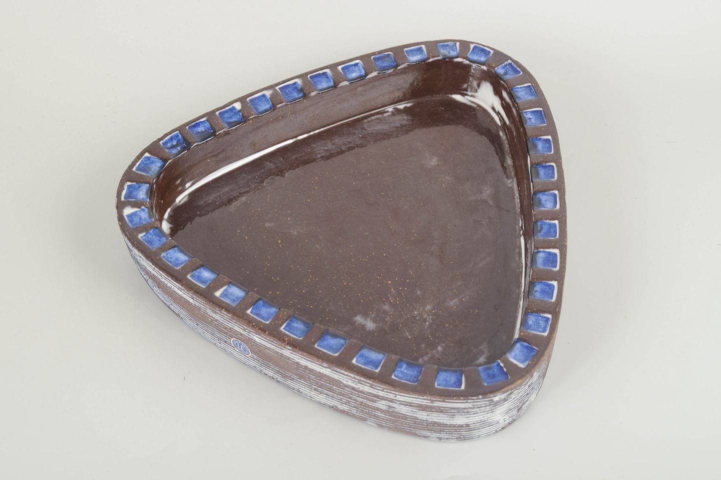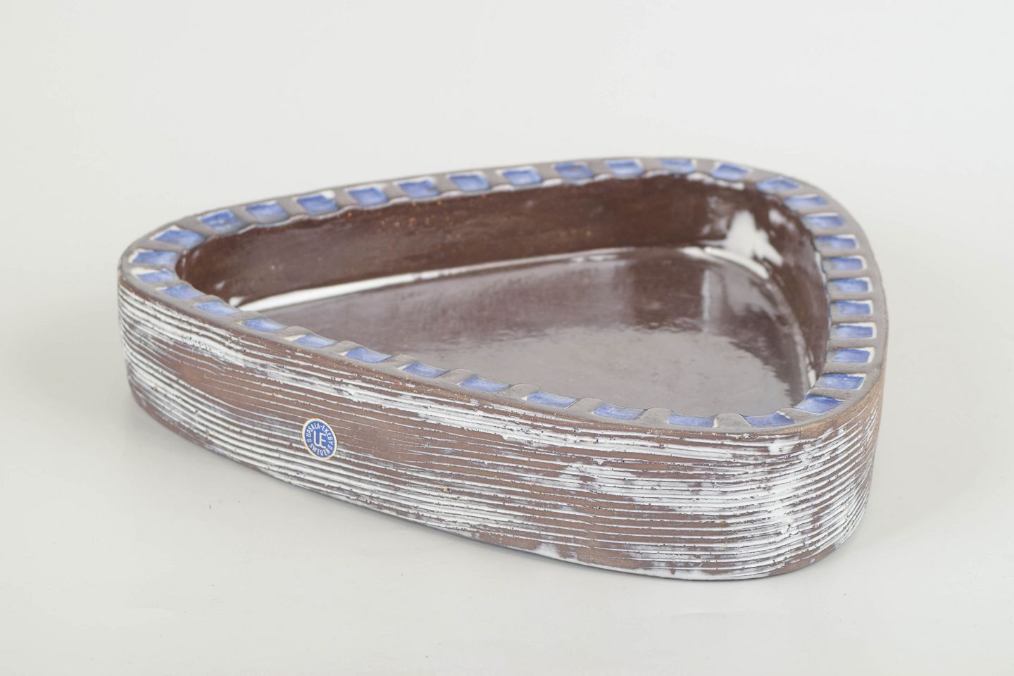 Lavt trekantet fad i glaseret keramik med brun base, hvidlaseret struktur og blå dekor langs kanten – et typisk eksempel på Simmulsons formsprog med organiske linjer og afdæmpede farver.