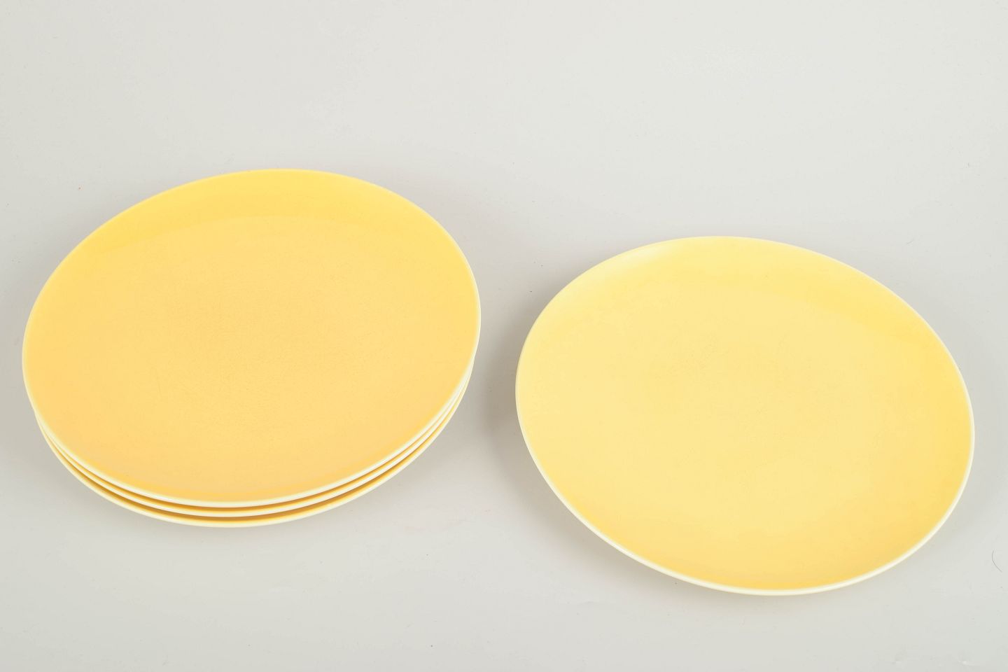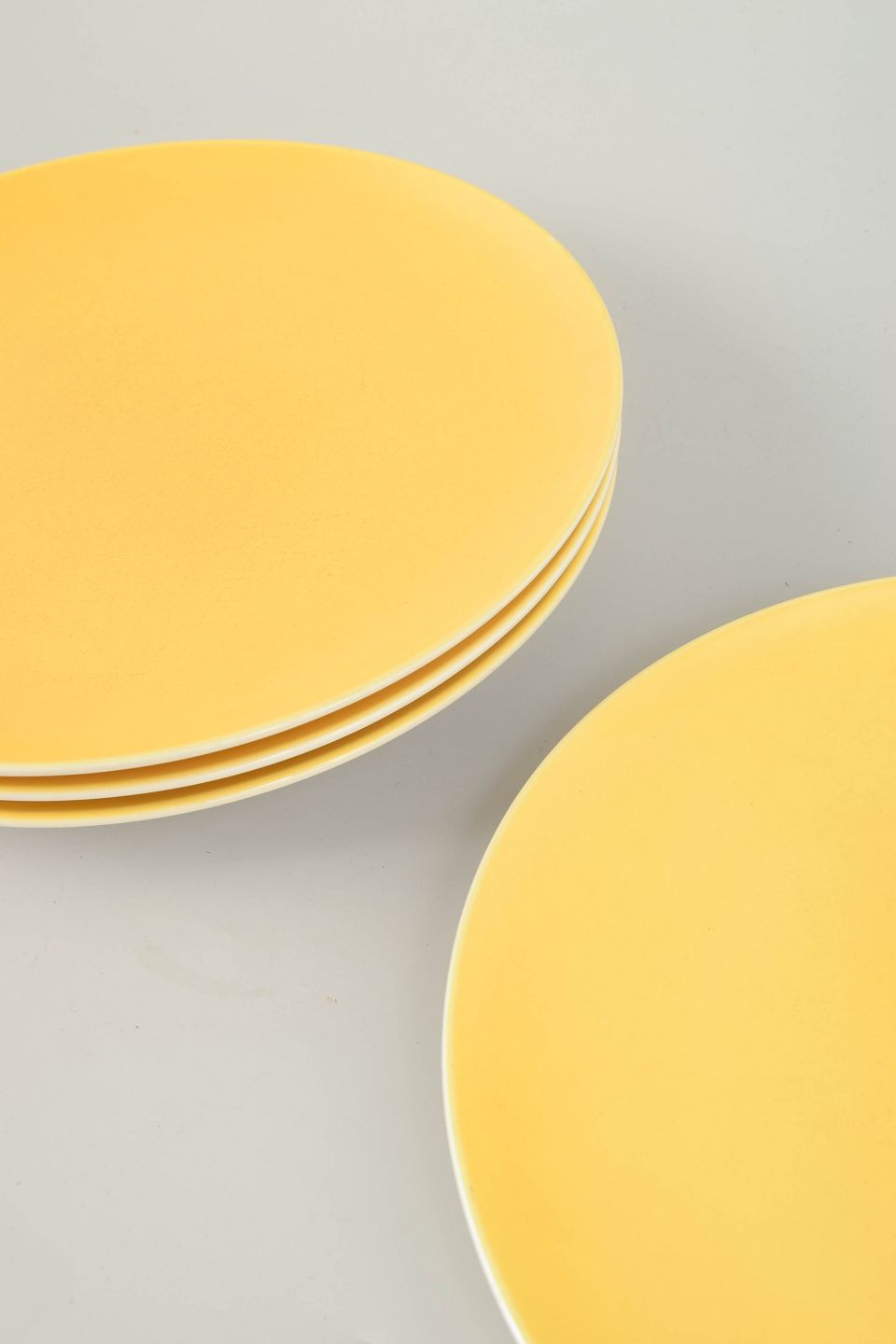 Set of four "Susanne" dinner plates in faience from Aluminia, in the signature yellow “Confetti” glaze. A refined and minimalist design with smooth contours and glossy finish — a classic example of Danish functionalist tableware from the period.