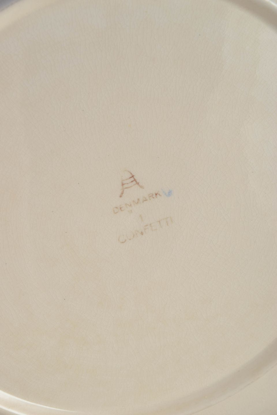Founded in 1863 and merged with Royal Copenhagen in 1882, Aluminia introduced several colourful series in the mid-20th century, including “Confetti,” which combined functional simplicity with bright optimism. The series became emblematic of Danish postwar modernism and remains highly sought after among collectors today.