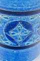Høj cylindrisk vase i keramik med reliefdekoration og karakteristisk “Rimini Blu”-glasur i intense blå og turkise nuancer. Overfladen er håndglaseret med geometriske mønstre og brune bånd, der fremhæver seriens levende farvespil og tekstur. Et klassisk eksempel på Aldo Londis ikoniske formsprog for Bitossi.