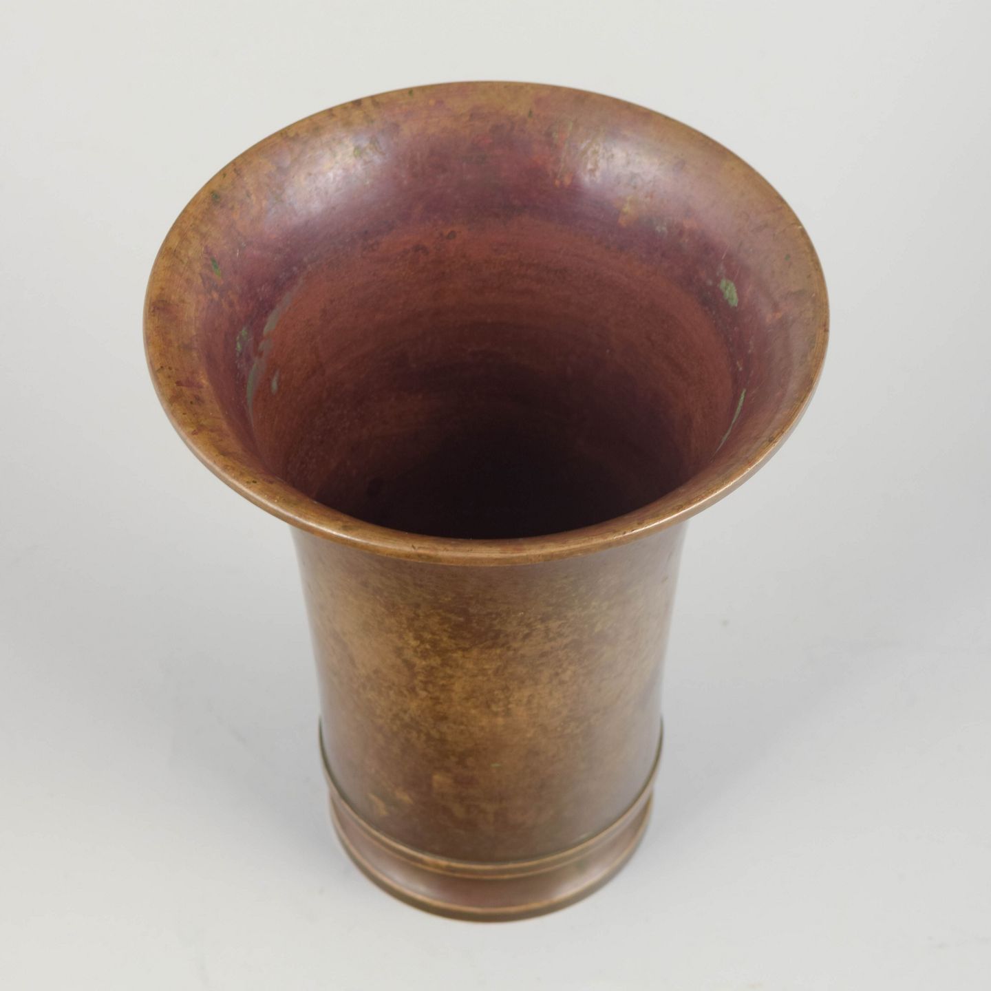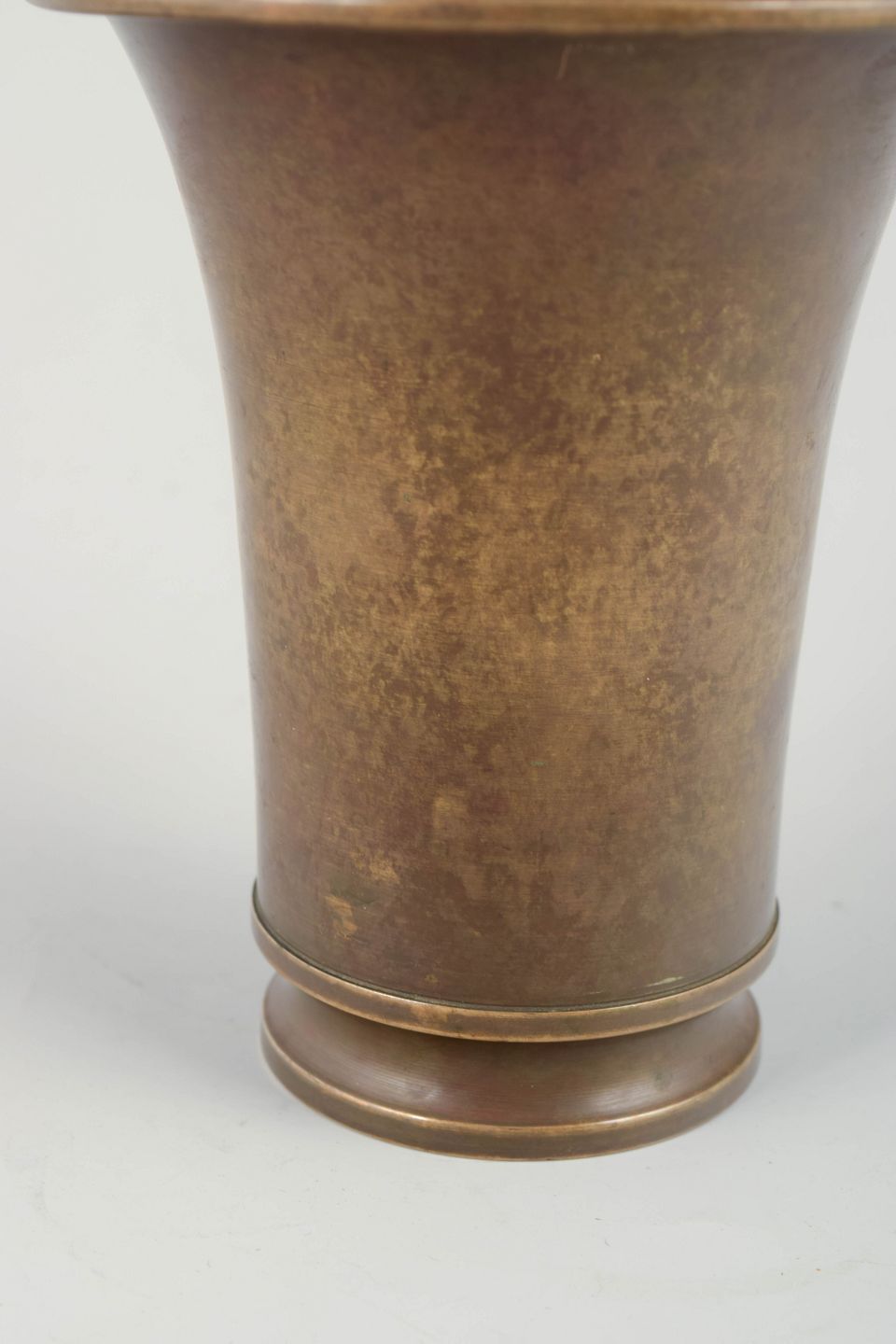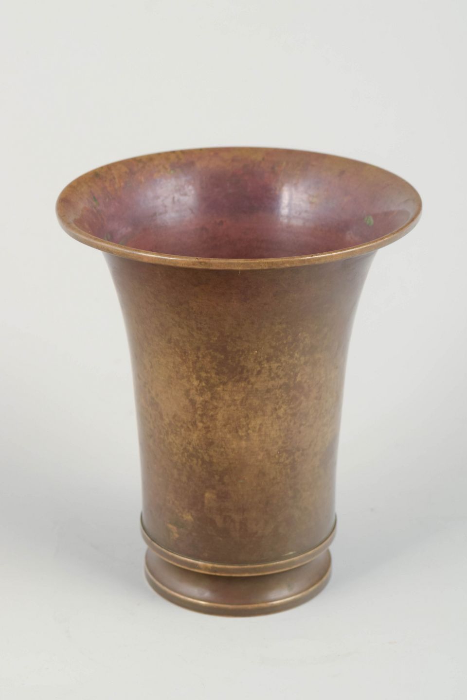 Klassisk Art Deco-vase i patineret bronze med konisk form og let udsvajet munding. Den varme brunlige overflade har naturlig patina og glød, typisk for perioden.