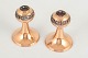 Elegant par lysestager i messing med dekorativ emalje i mørkegrønne og sorte nuancer omkring toppen. Den skulpturelle form fremhæver den nordiske modernismes raffinerede udtryk.