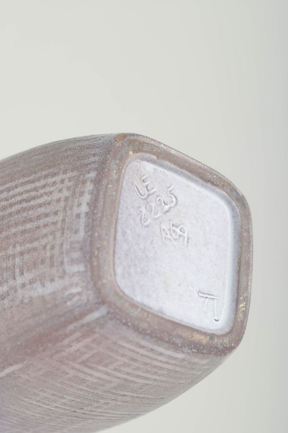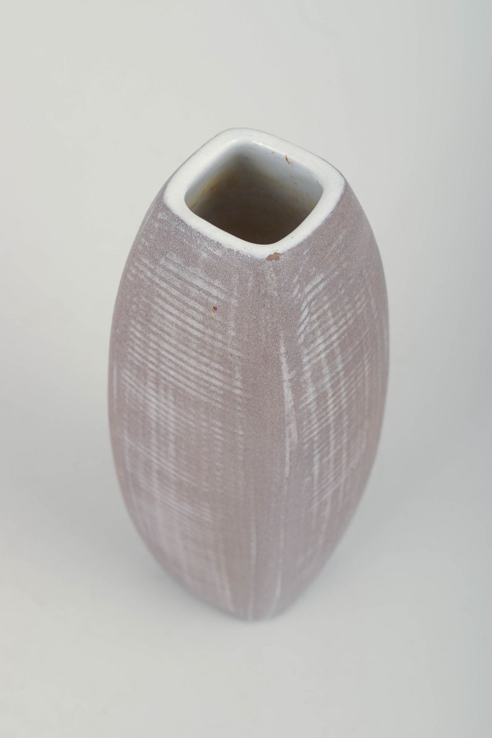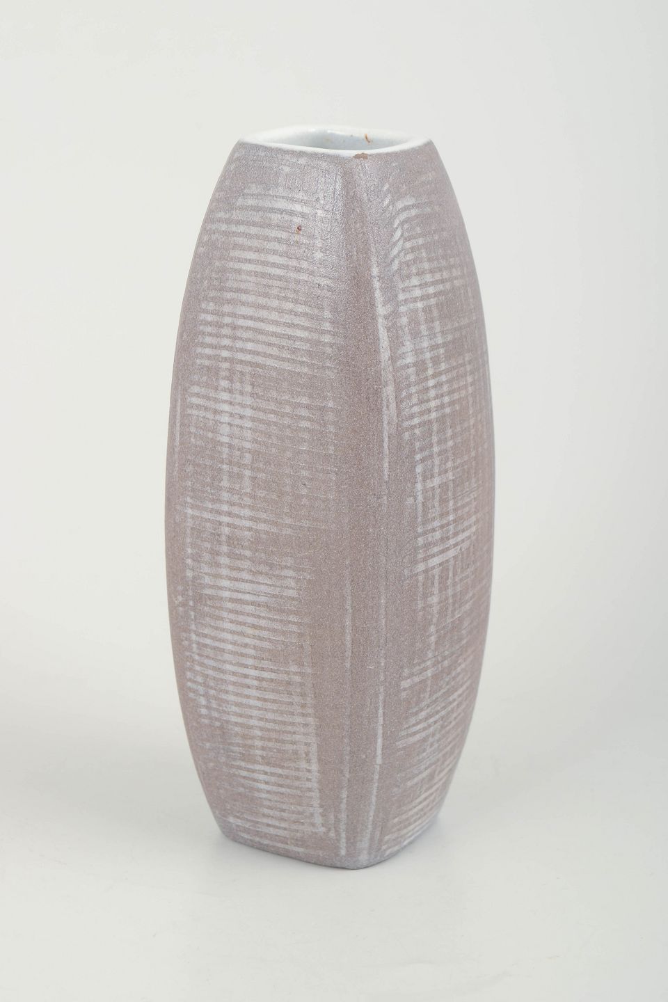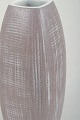 Elegant, firsidet vase i stentøj med mat rosa/lilla glasur og hvidt indre, dekoreret med karakteristiske indridset linjemønster. Model 2225.