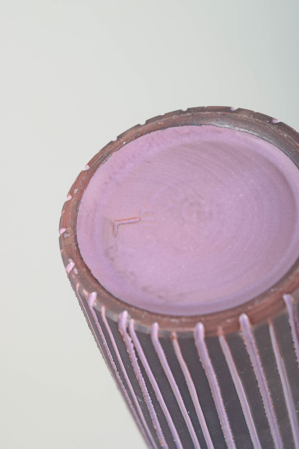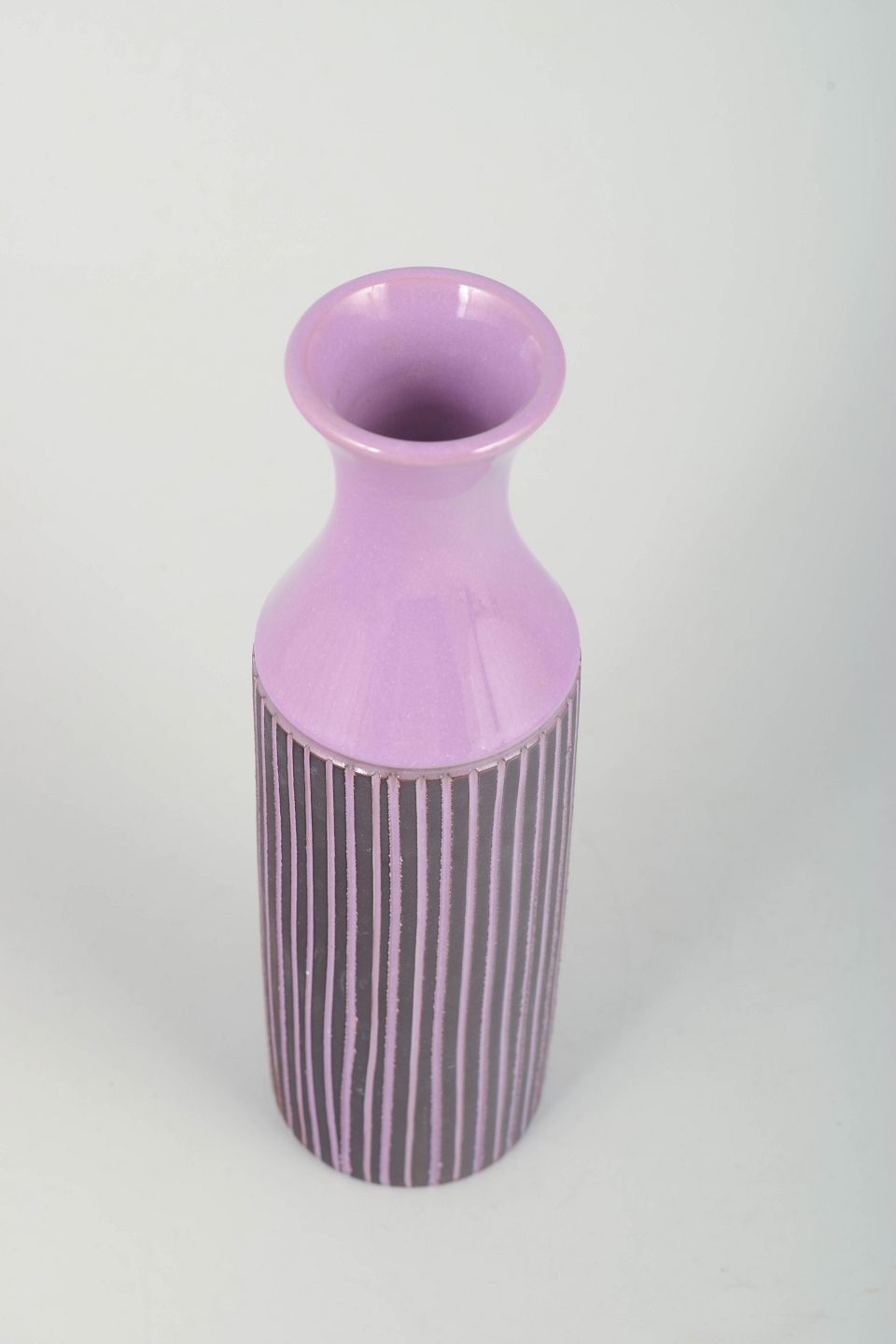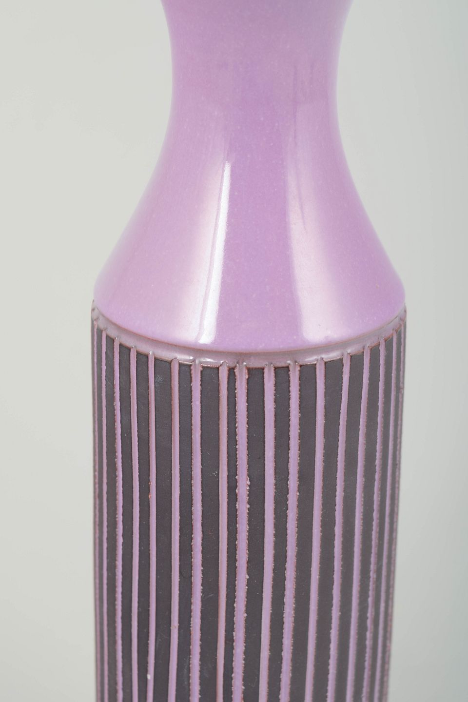 Høj, cylindrisk retrovase i lilla/purpurfarvet glasur med håndmalede lodrette striber i mørke og lyse toner. Klassisk 70’er-æstetik med grafisk dekor og slank form. Undersiden er signeret, men signaturen er utydelig.