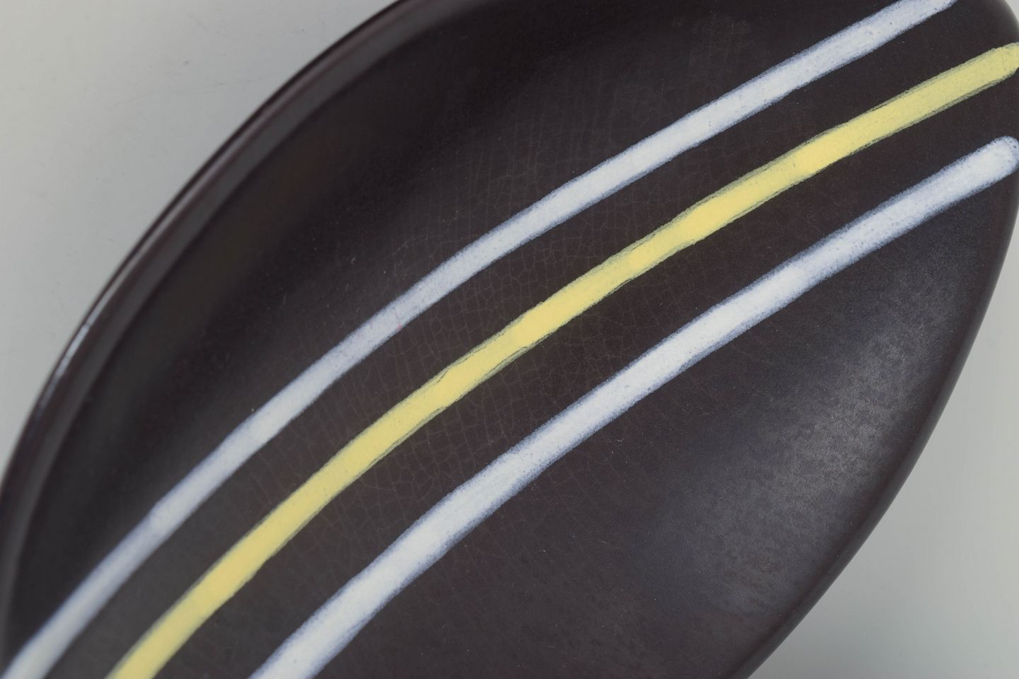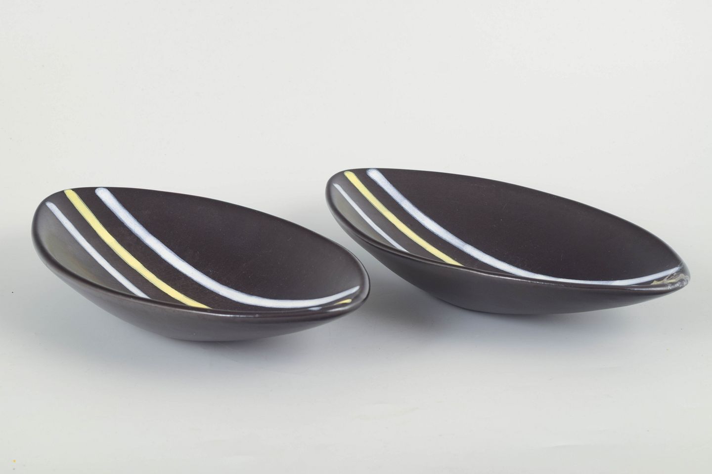 To keramiske skåle fra den ikoniske “Trio”-serie, dekoreret med karakteristiske hvide og gule linjer på mørk baggrund. Aflang, elegant form, typisk for Oldfors’ modernistiske designs.