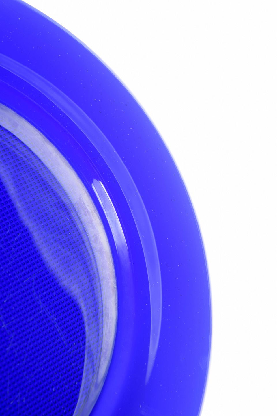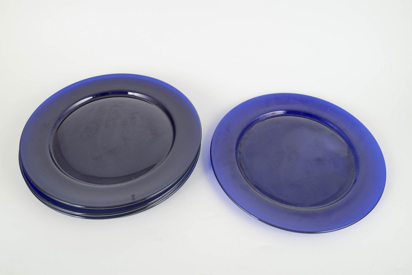 Sæt på fem dybblå dæktallerkener i tykt, transparent kunstglas. Den klare, mættede koboltblå farve og den enkle runde form giver et elegant og tidstypisk udtryk, typisk for skandinavisk glasdesign fra 1980’erne.