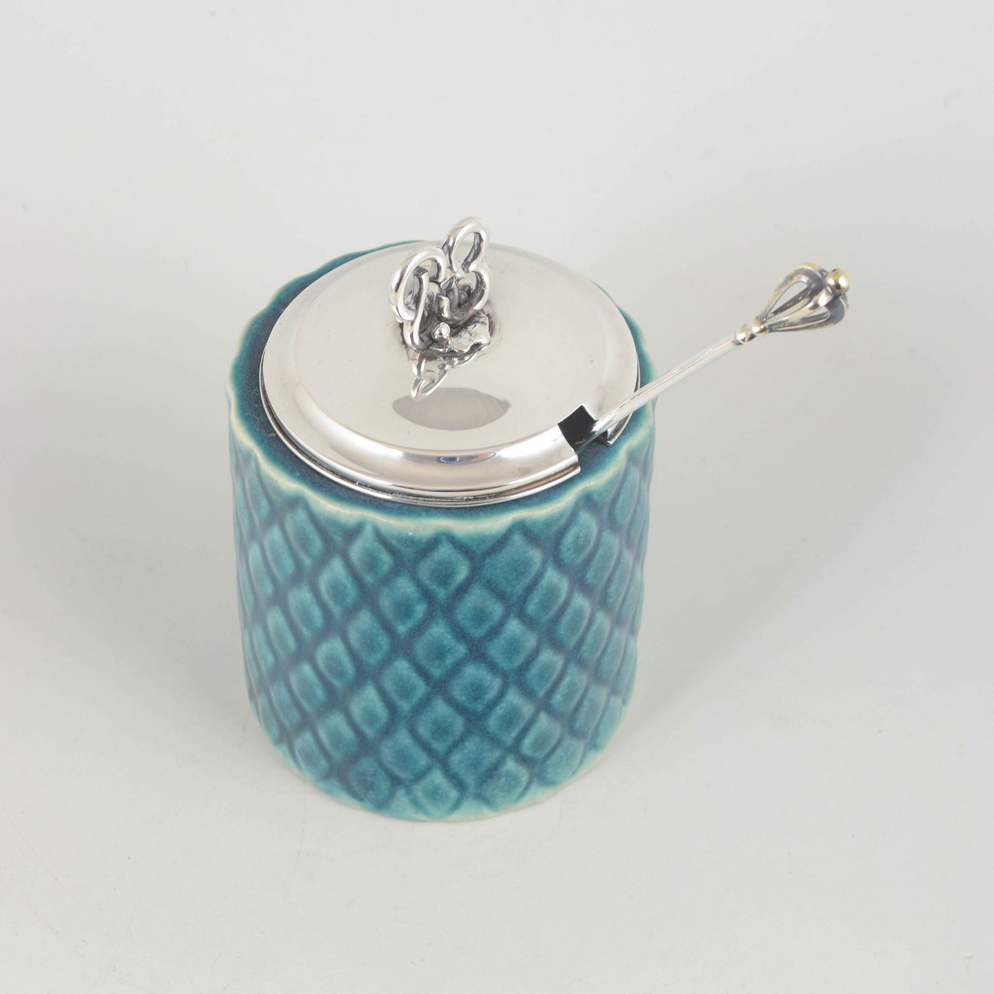 Marmeladekrukke med tretårnet låg og tretårnet sølvske, midt 1900-tallet.