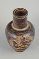 Skulpturelt dekoreret vase i den karakteristiske Sung-glasur, med reliefmotiv af figurativ scene. Den varme, løbende glasur fremhæver de plastiske detaljer og giver værket et markant, næsten metallisk skær.