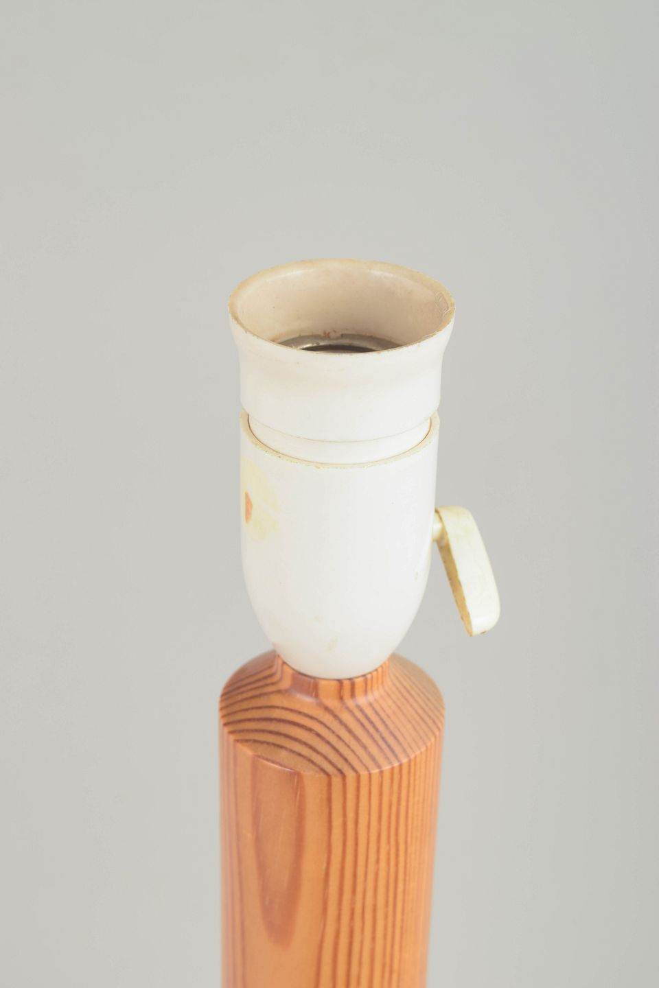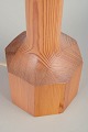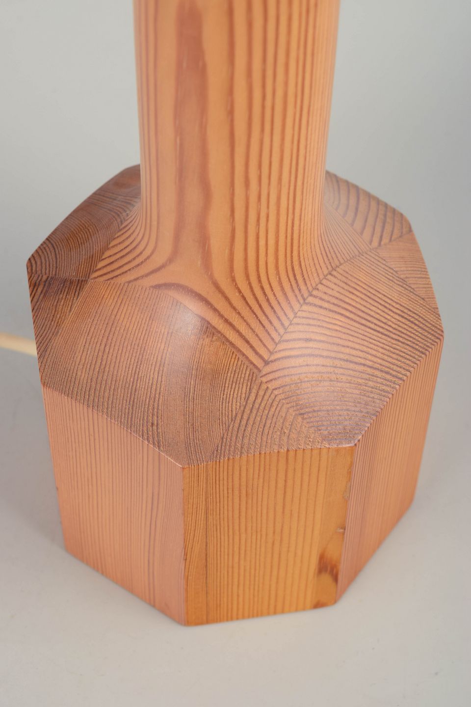 Slank og geometrisk bordlampe udført i massivt oregon pine med tydelig årestruktur. Den oktagonale fod går elegant over i en lang, facetteret skaftprofil, hvilket giver lampen et minimalistisk, arkitektonisk udtryk karakteristisk for skandinavisk 70’er-design.