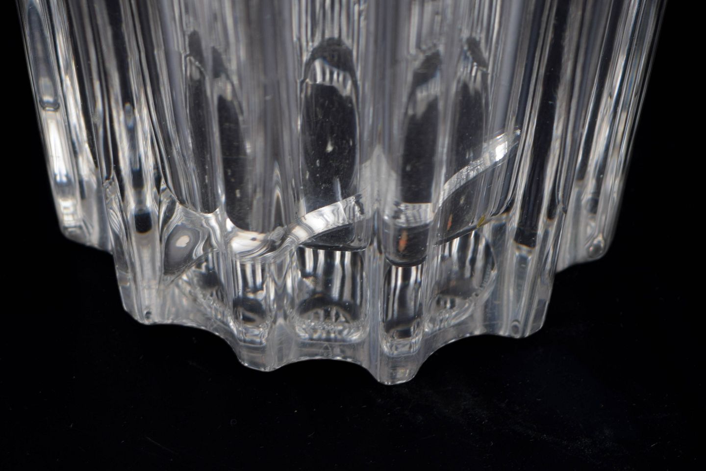 Klar art deco kunstglasvase med markante lodrette ribber og blødt bølget kant, udført i den karakteristiske stil kendt fra Pierre d’Avesns dekorative glasarbejder. Kombinationen af struktureret overflade og organisk åbning giver vasen et elegant, skulpturelt udtryk.