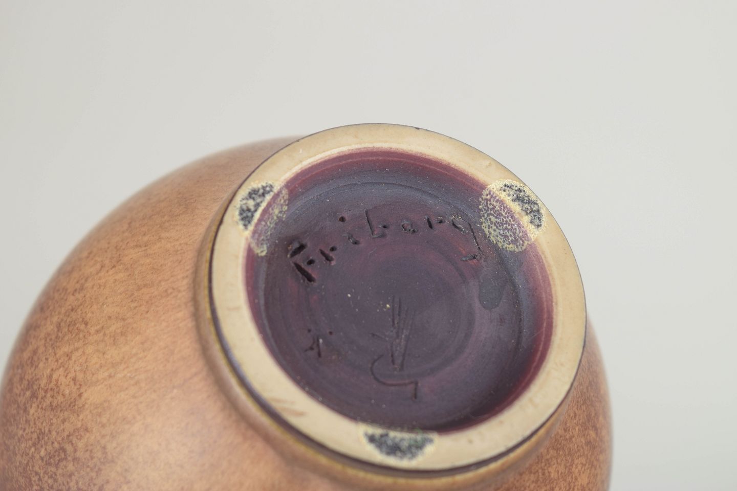 Elegant, slankhalset studio-drejet vase udført i stentøj med karakteristisk, fintharmoniseret glasur i varme brune og violette nuancer. Formen er balanceret og præcist proportioneret, med en blød overgang mellem den pæreformede krop og den lange, smalle hals – et klassisk eksempel på Berndt Fribergs modne arbejder fra Gustavsberg Studio.