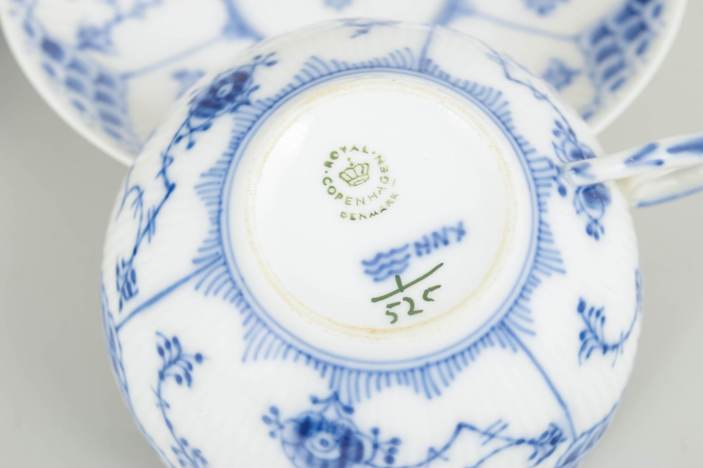 Sæt bestående af 3 tekopper med tilhørende underkopper i Musselmalet halvblonde. Klassiske riflede former med blonder og håndmalet koboltblå dekoration. Et harmonisk og anvendeligt tesæt fra sen produktion.