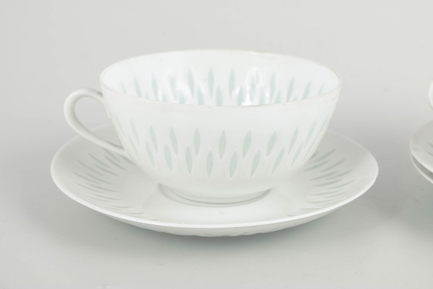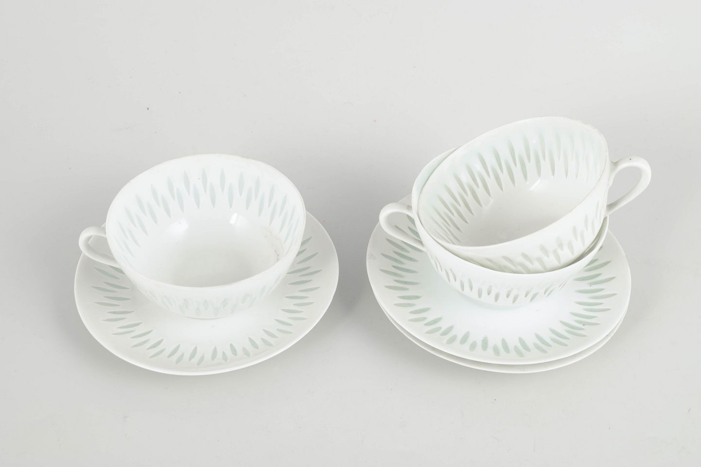 Sæt bestående af tre tekopper med tilhørende underkopper i hvidt porcelæn med gennembrudt “rice porcelain”-dekoration. De aflange perforeringer udfyldt med transparent glasur giver porcelænet et let og næsten translucent udtryk, mens de enkle, afrundede former er karakteristiske for Friedl Holzer-Kjellbergs sene modernistiske porcelænsdesign for Arabia.