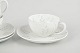 Elegant sæt bestående af tre mokkakopper med tilhørende underkopper i hvidt porcelæn, dekoreret med diskret bladornamentik udført i transparente, let grønligt tonede glasurfelter. Det lette og raffinerede udtryk samt de bløde, harmoniske former er karakteristisk for Friedl Holzer-Kjellbergs sene porcelænsdesign for Arabia.