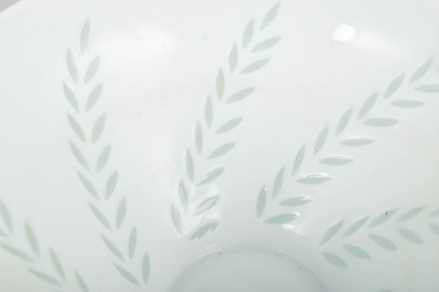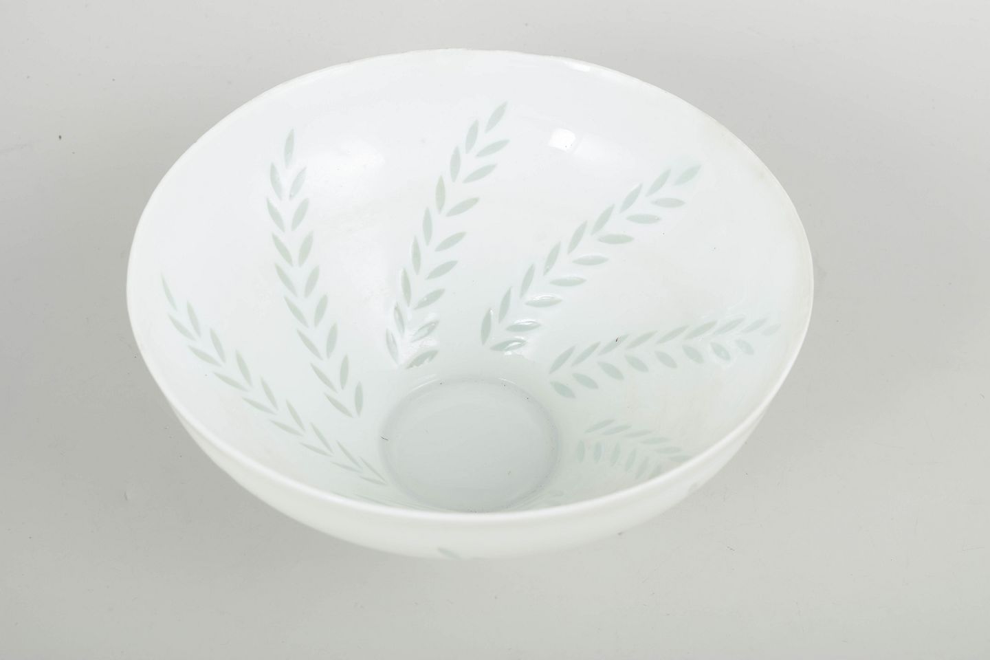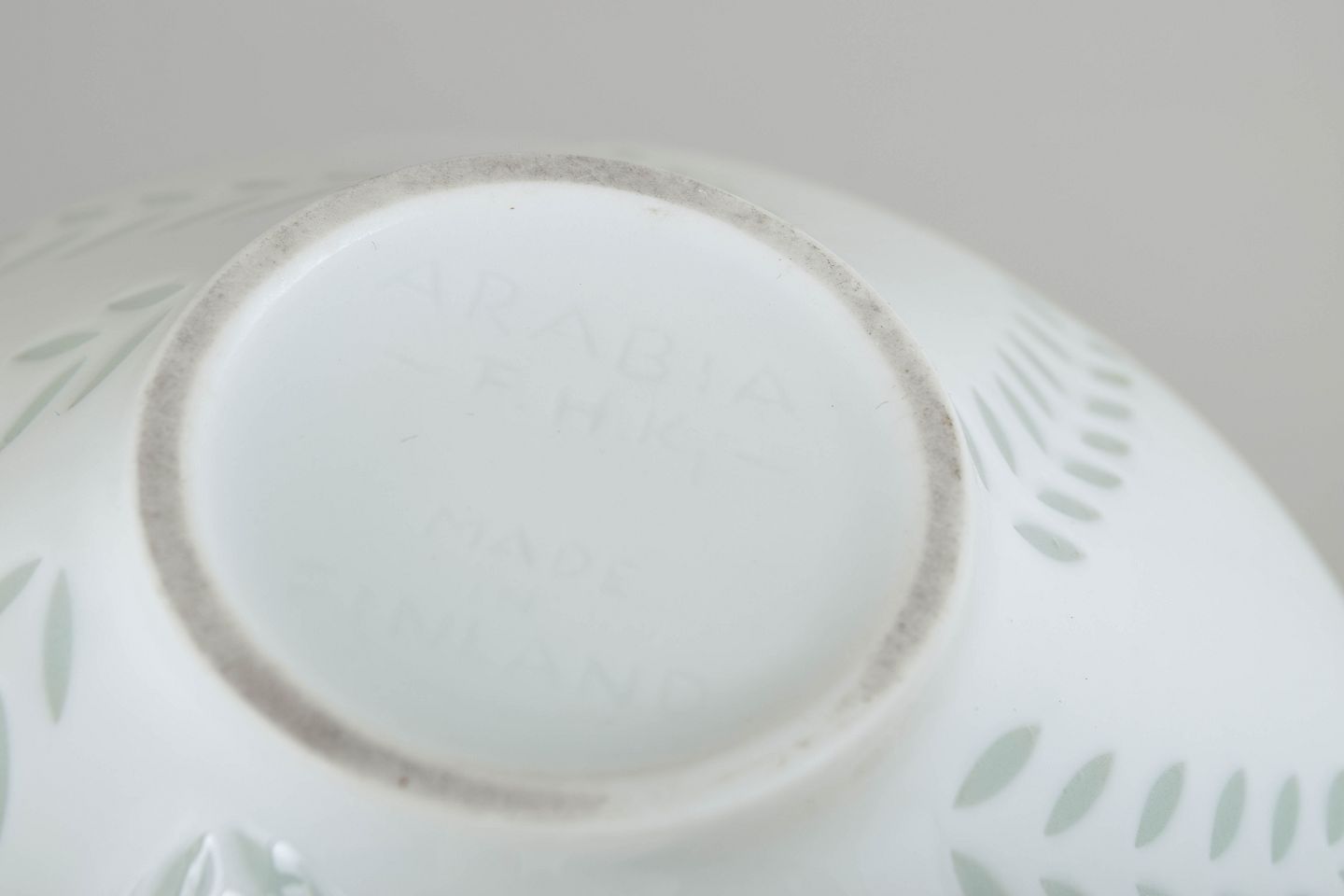Stor skål i hvidt porcelæn med diskret bladornamentik udført i transparente, let grønligt tonede felter. Den enkle, koniske form kombineret med den afdæmpede dekoration giver skålen et let og elegant udtryk, karakteristisk for Friedl Holzer-Kjellbergs modernistiske porcelænsdesign for Arabia.