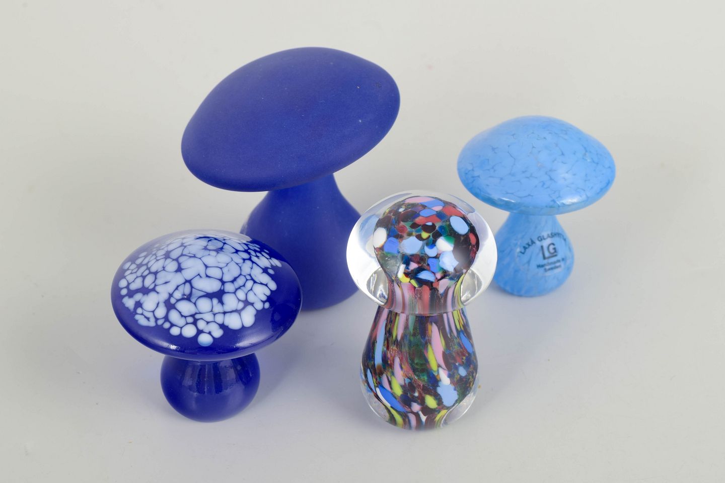 Dekorativ gruppe af svampe i kunstglas i varierende former og farver, herunder dybblå, lyseblå og flerfarvet glas. Organiske silhuetter med markant fokus på farvespil og overfladeeffekter. Mærkat forekommer på nogle eksemplarer.