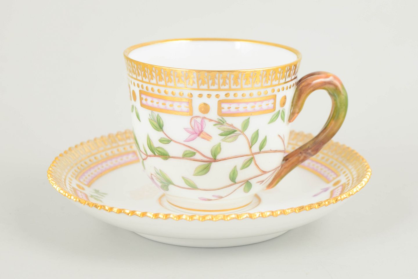 Elegant moccakop med tilhørende underkop i det ikoniske Flora Danica-stel. Koppen er håndmalet med botanisk motiv gengivet efter Flora Danica-værket og udført i stellets karakteristiske, raffinerede formsprog med dekorativ kant. En klassisk og eksklusiv kaffekop.