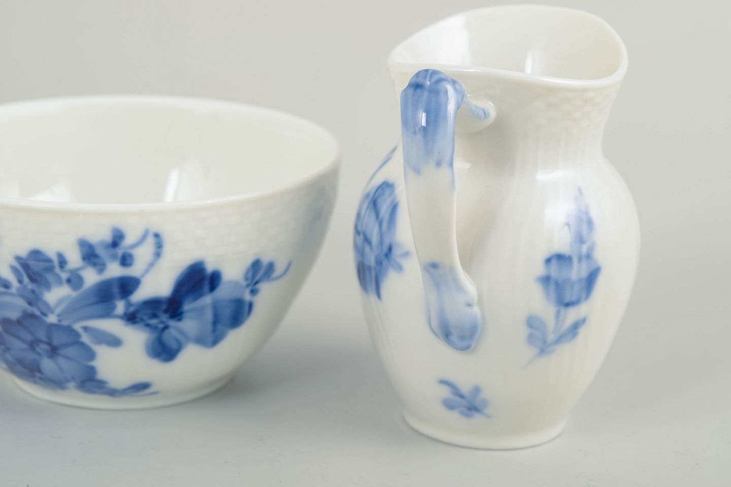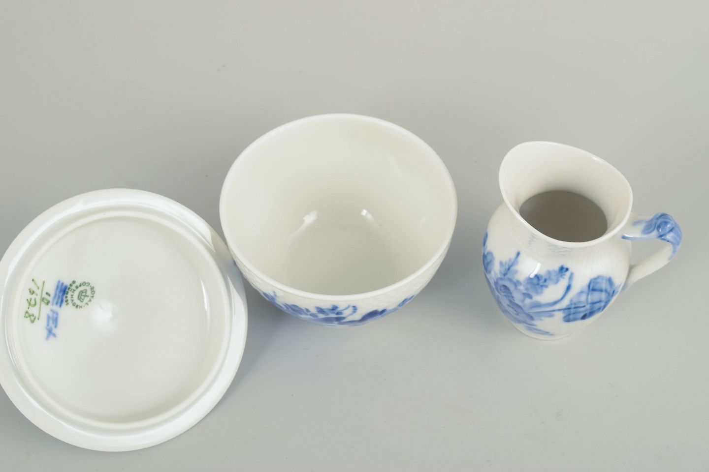Royal Copenhagen, blå blomst flettet sukkerskål og flødekande.