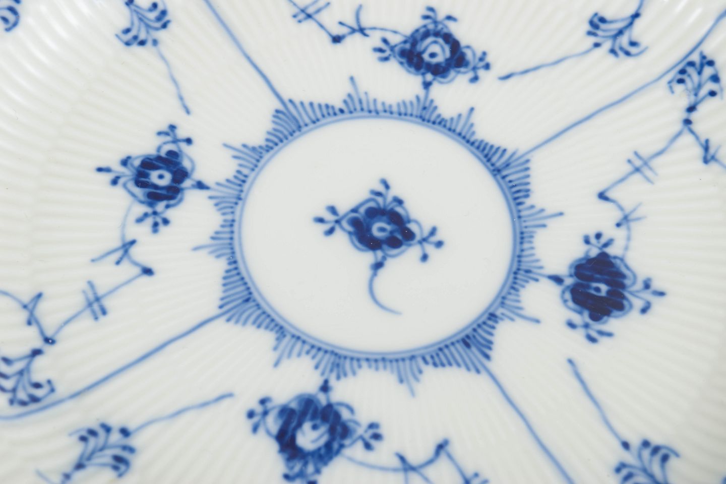 Musselmalet helblonde er blandt de mest raffinerede varianter af Royal Copenhagens klassiske musselmalede stel og er kendt for den detaljerede, gennembrudte blondekant, som kræver et højt håndværksmæssigt niveau.
