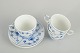 Sæt bestående af tre kaffekopper med tilhørende underkopper i glaseret porcelæn, dekoreret med håndmalet underglasur i det klassiske musselmalede mønster. Model 1/298.