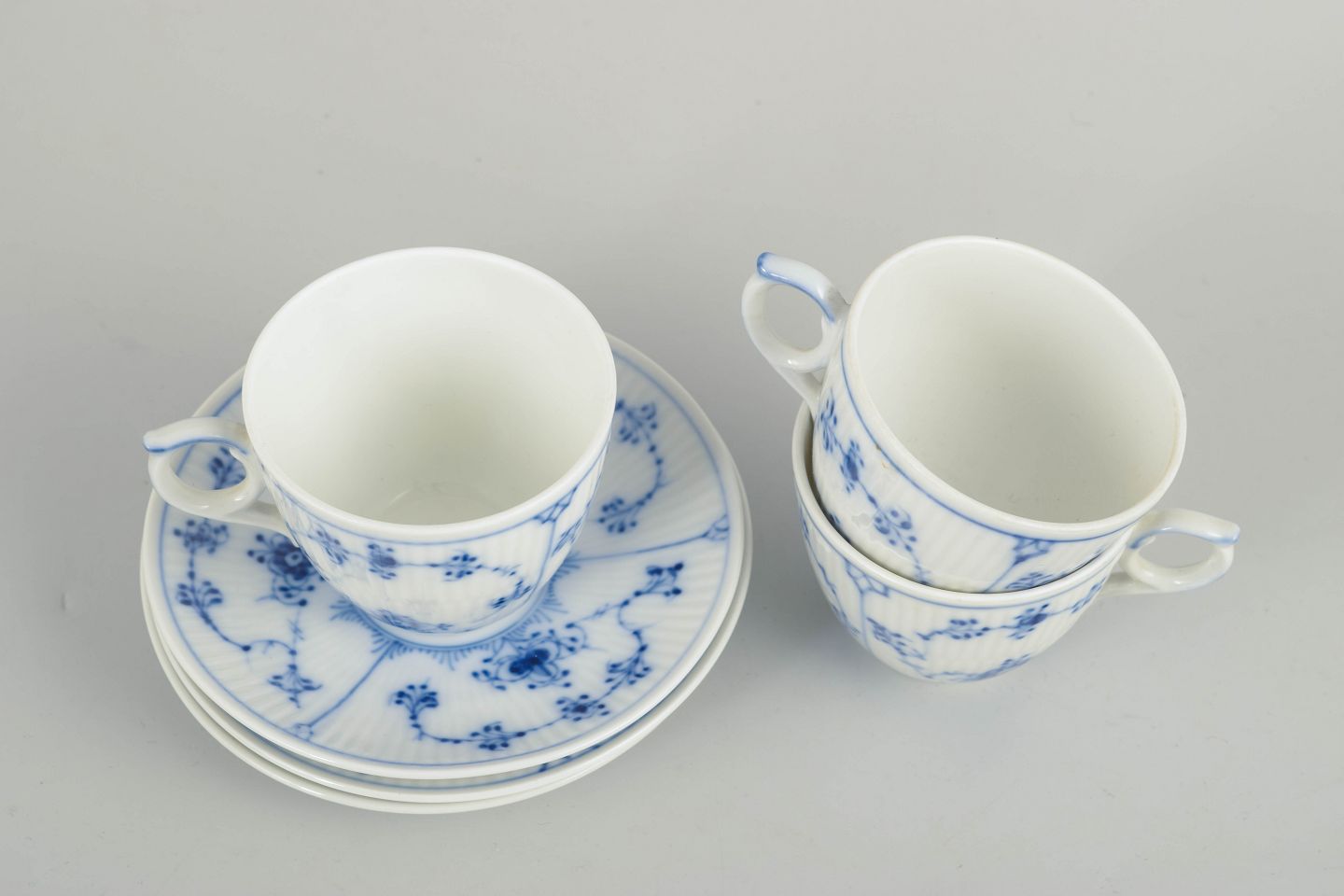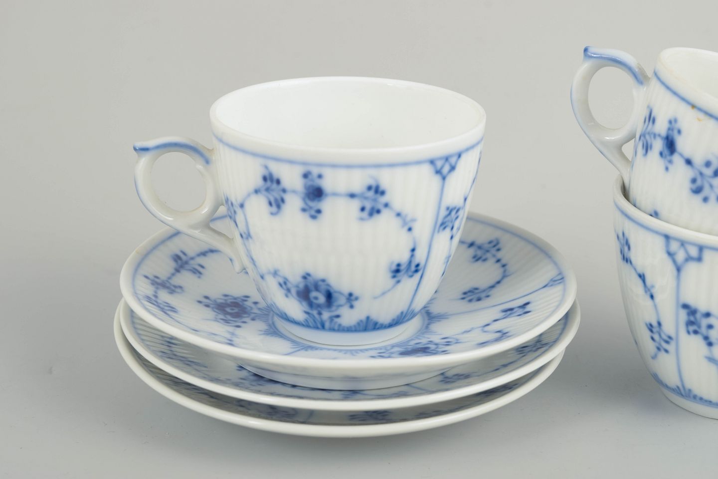 Royal Copenhagen, Musselmalet riflet kaffekopper med tilhørende underkopper, sæt af 3.