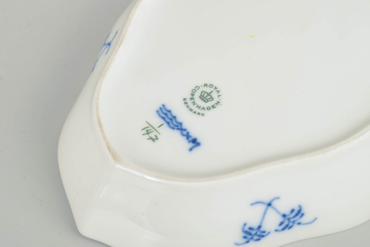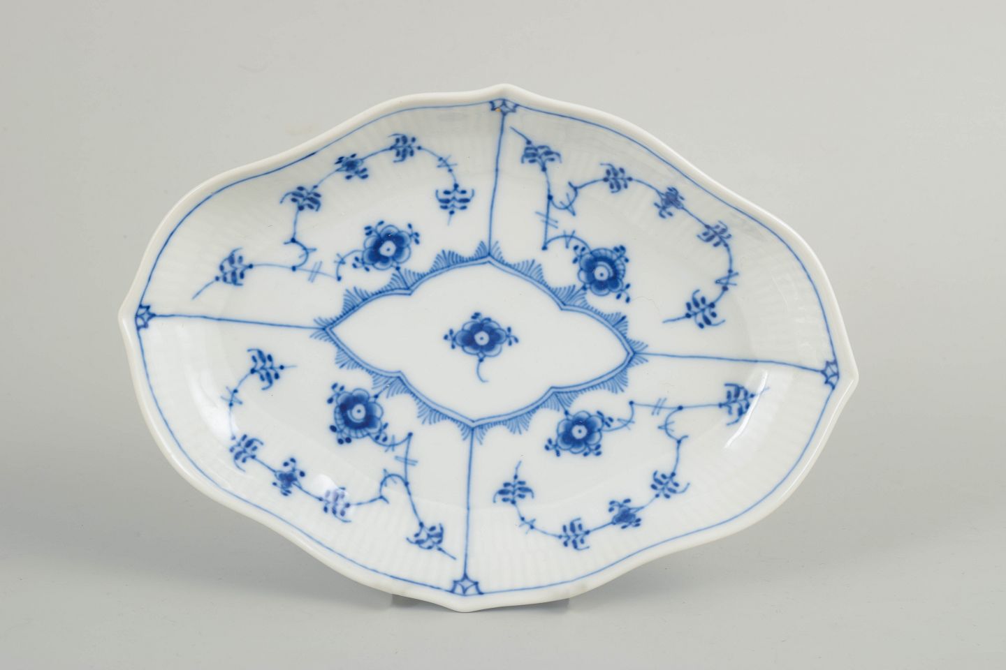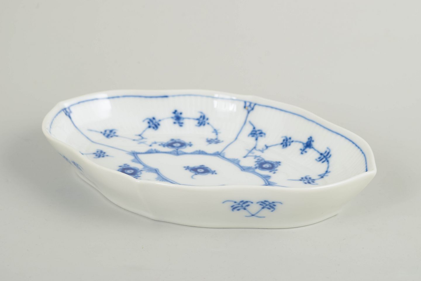 Aflangt fad i glaseret porcelæn med håndmalet underglasurdekoration i klassisk musselmalet mønster. Model 1/147.