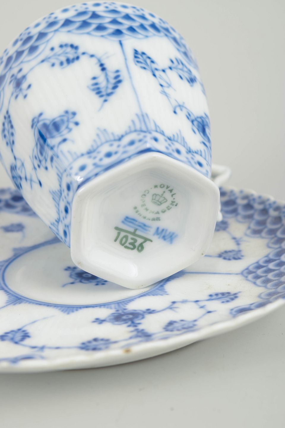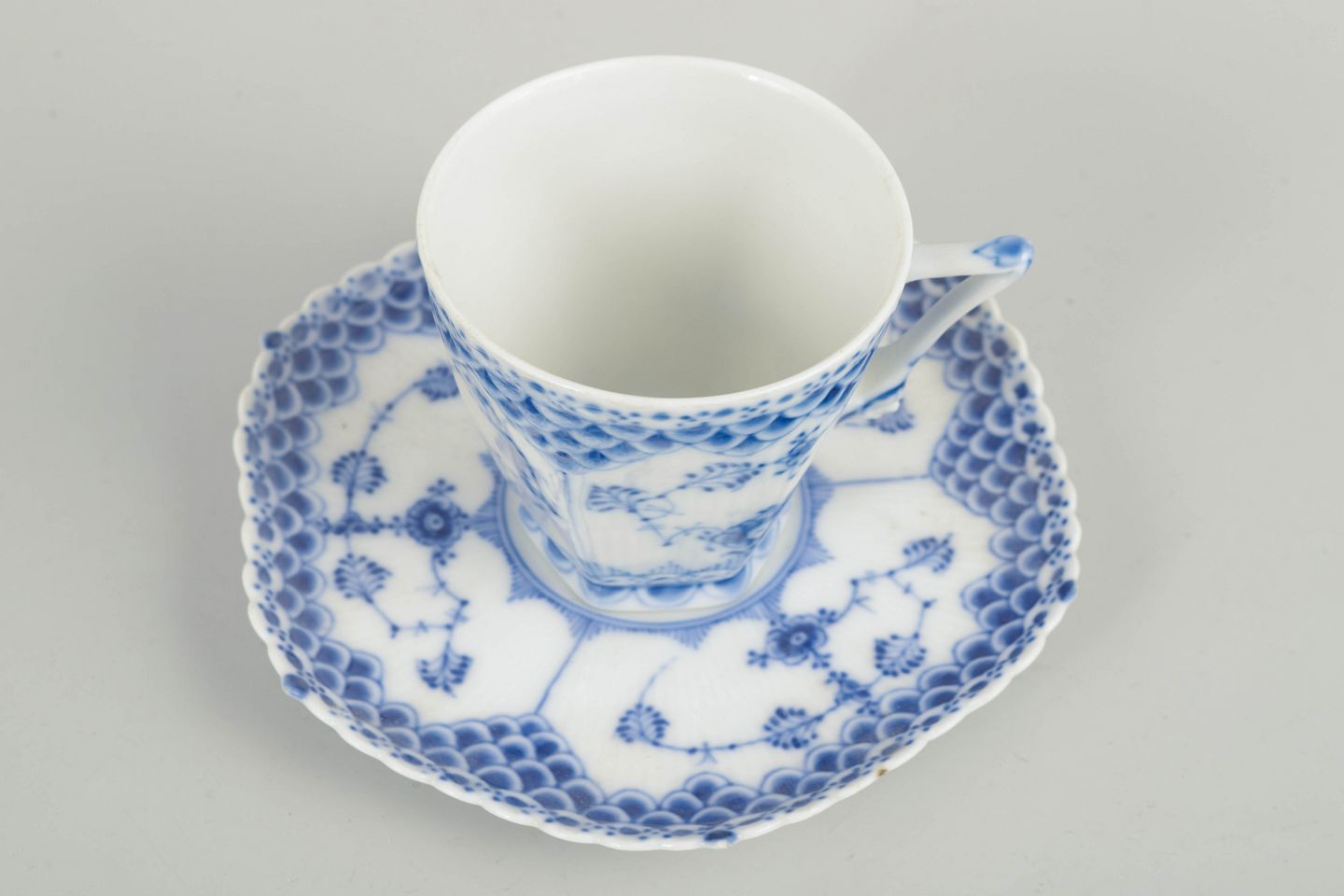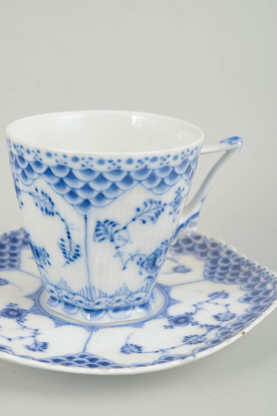 Musselmalet helblonde er blandt Royal Copenhagens mest ikoniske håndmalede stel, kendetegnet ved den klassiske blå dekoration, den riflede form og den rige blondedetalje.