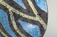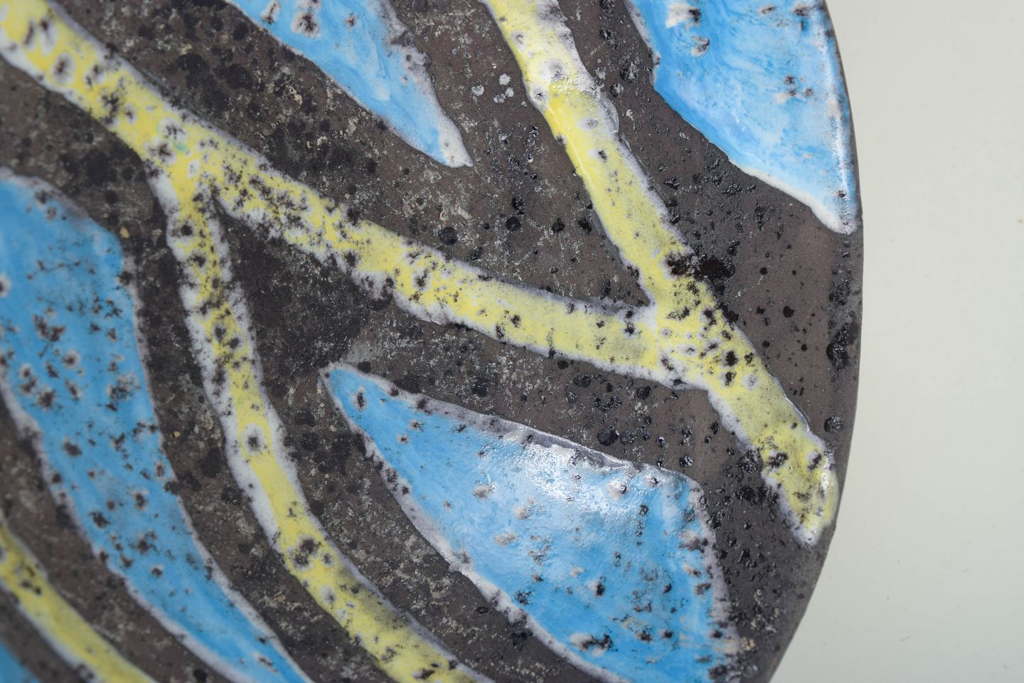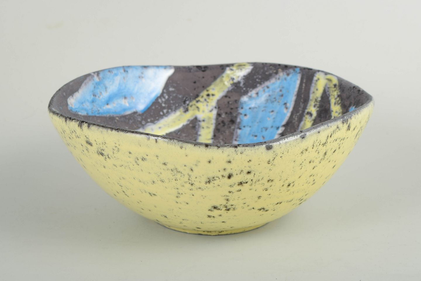Skål i glaseret keramik med rund, let konisk form og hånddekoreret inderside i abstrakt mønster med blå, gule og mørke felter. Ydersiden er dækket af en gul glasur med karakteristisk sprøjtet overflade, typisk for Gambones arbejde i perioden.