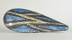 Large, organically shaped oval bowl in glazed ceramic with an abstract, hand-decorated pattern in blue, yellow and dark tones, featuring a characteristic speckled/splashed glaze effect.