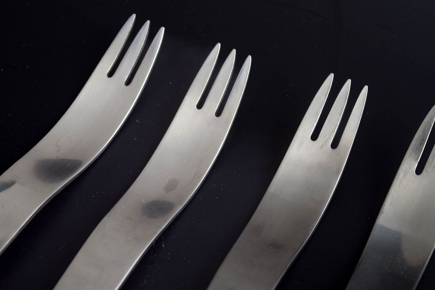 Fem middagsgafler i rustfrit stål.