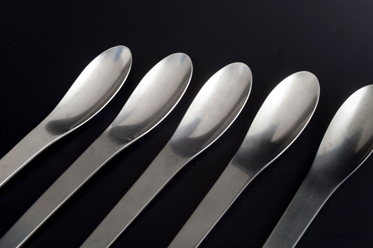 Sæt bestående af fem spiseskeer i rustfrit stål med enkelt og funktionelt formsprog, velegnet til daglig brug.