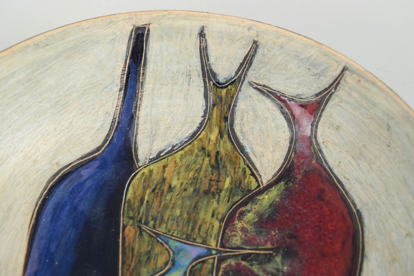 Lav, rund skål i glaseret keramik med abstraheret figurkomposition i relief, udført i dybe blå, grønne og røde toner mod lys bund. Kompositionen har et markant modernistisk udtryk med klare konturer og en malerisk glasurbehandling. Signeret på bunden “Fantoni, Italy”.