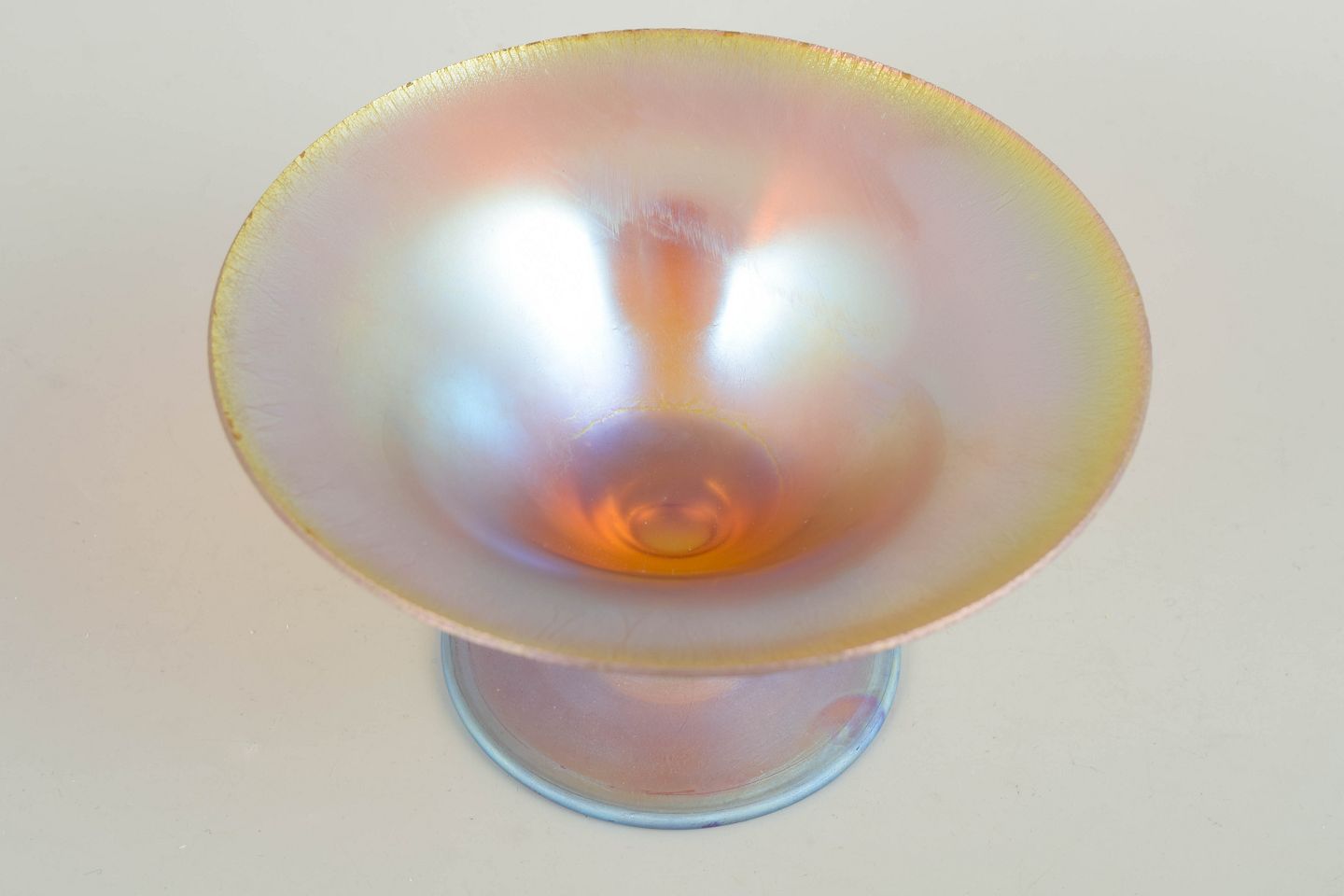Lille fodskål i iriserende kunstglas, model nævnt i beskrivelsen, med let udsvajet kumme og lav fod; den perlemorsskinnende overflade giver et levende farvespil, karakteristisk for periodens dekorative glas.