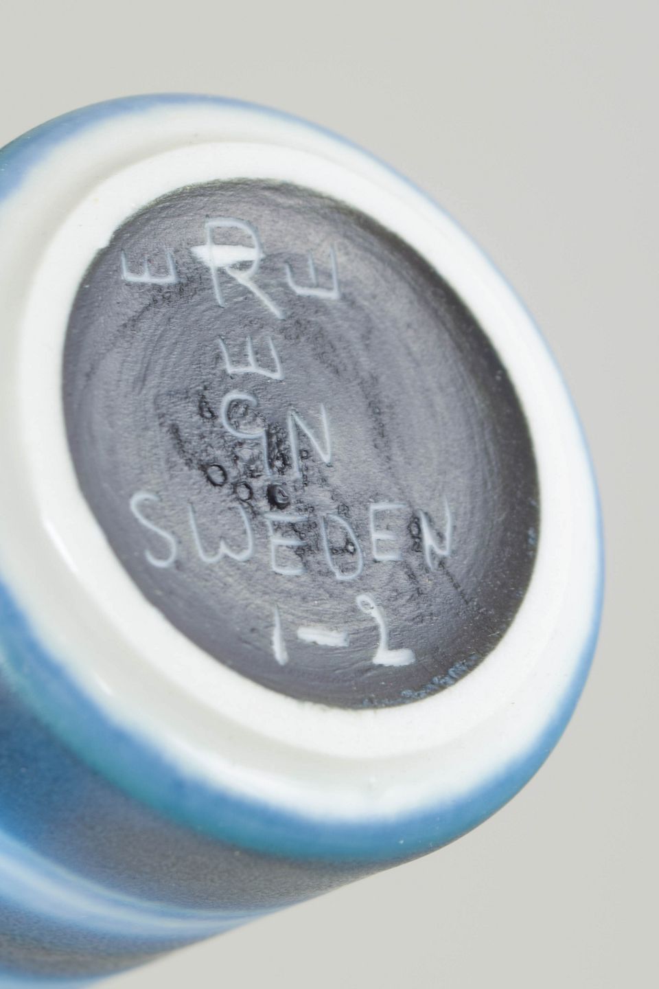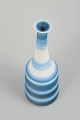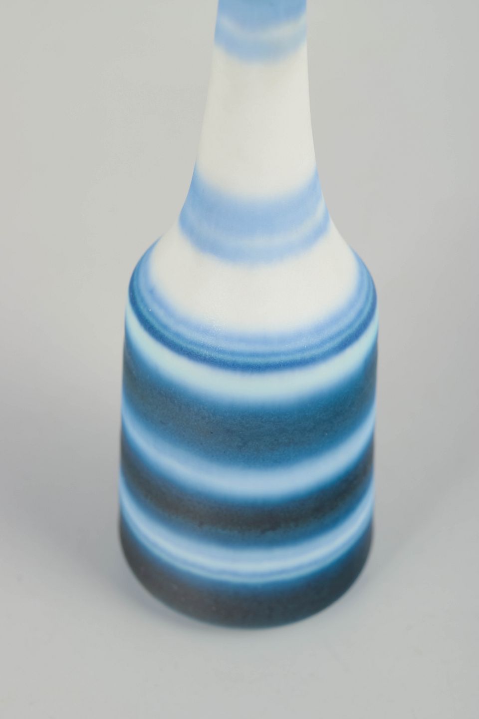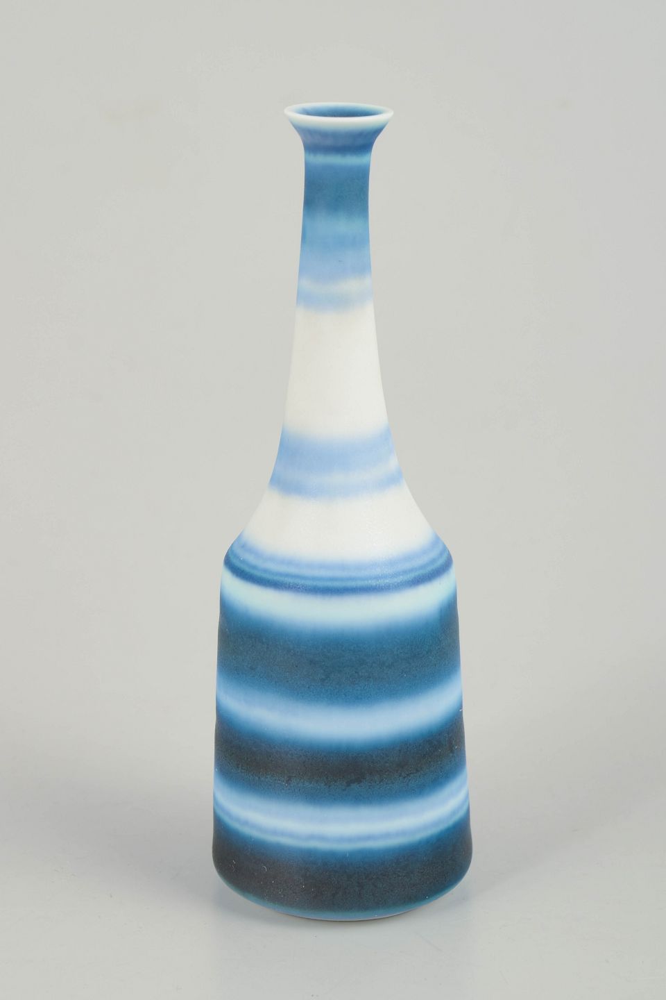 Slender miniature vase in thrown stoneware with horizontal bands in blue and white tones, executed in Nylund’s characteristic glaze work.
