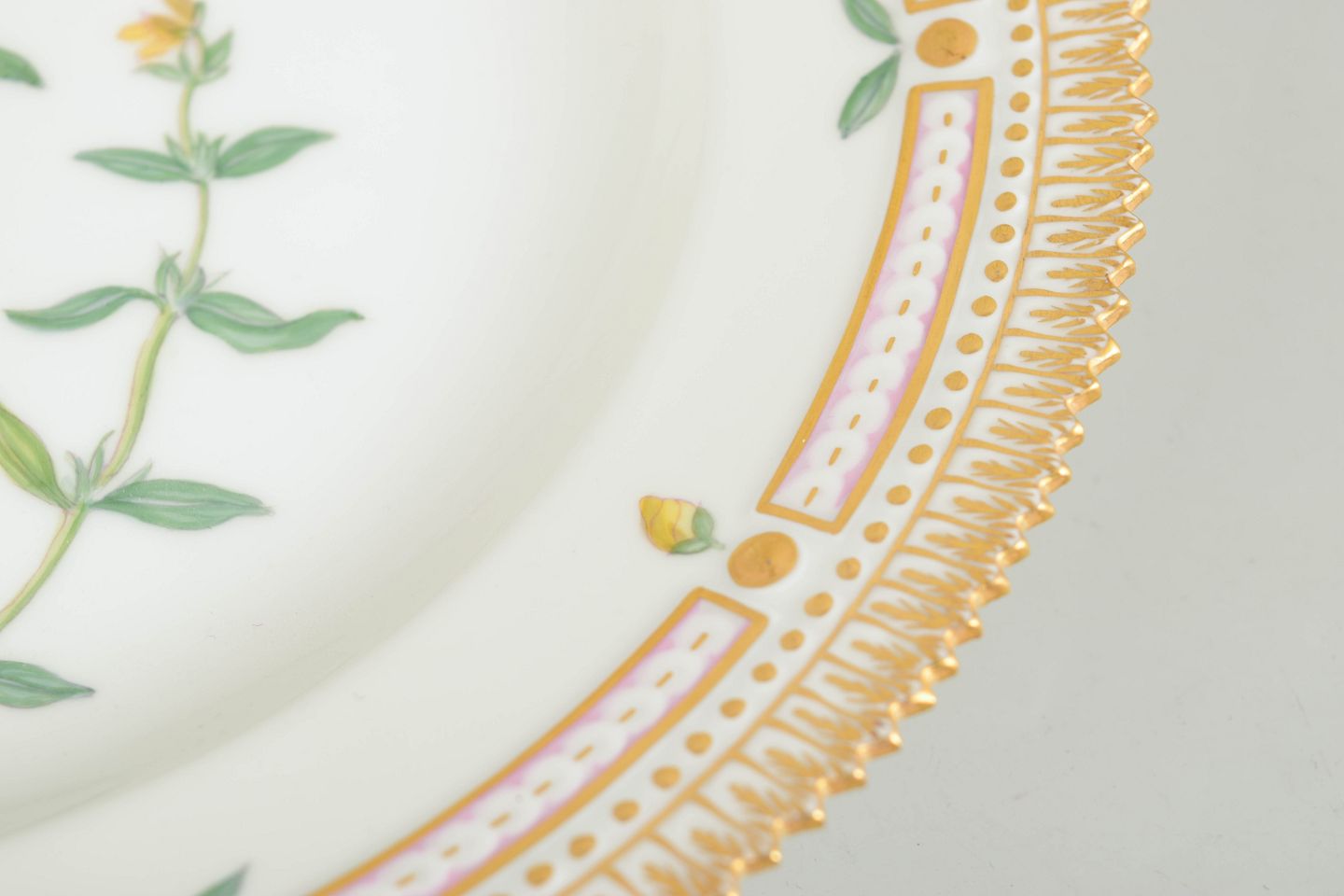 Middagstallerken i porcelæn med håndmalet botanisk motiv fra det eksklusive Flora Danica-stel, udført i naturalistiske farver og indrammet af rigt forgyldt bort.