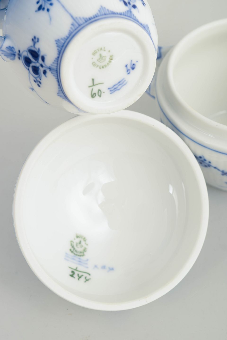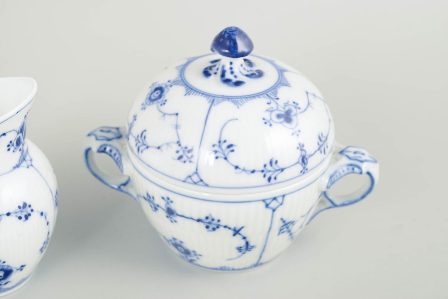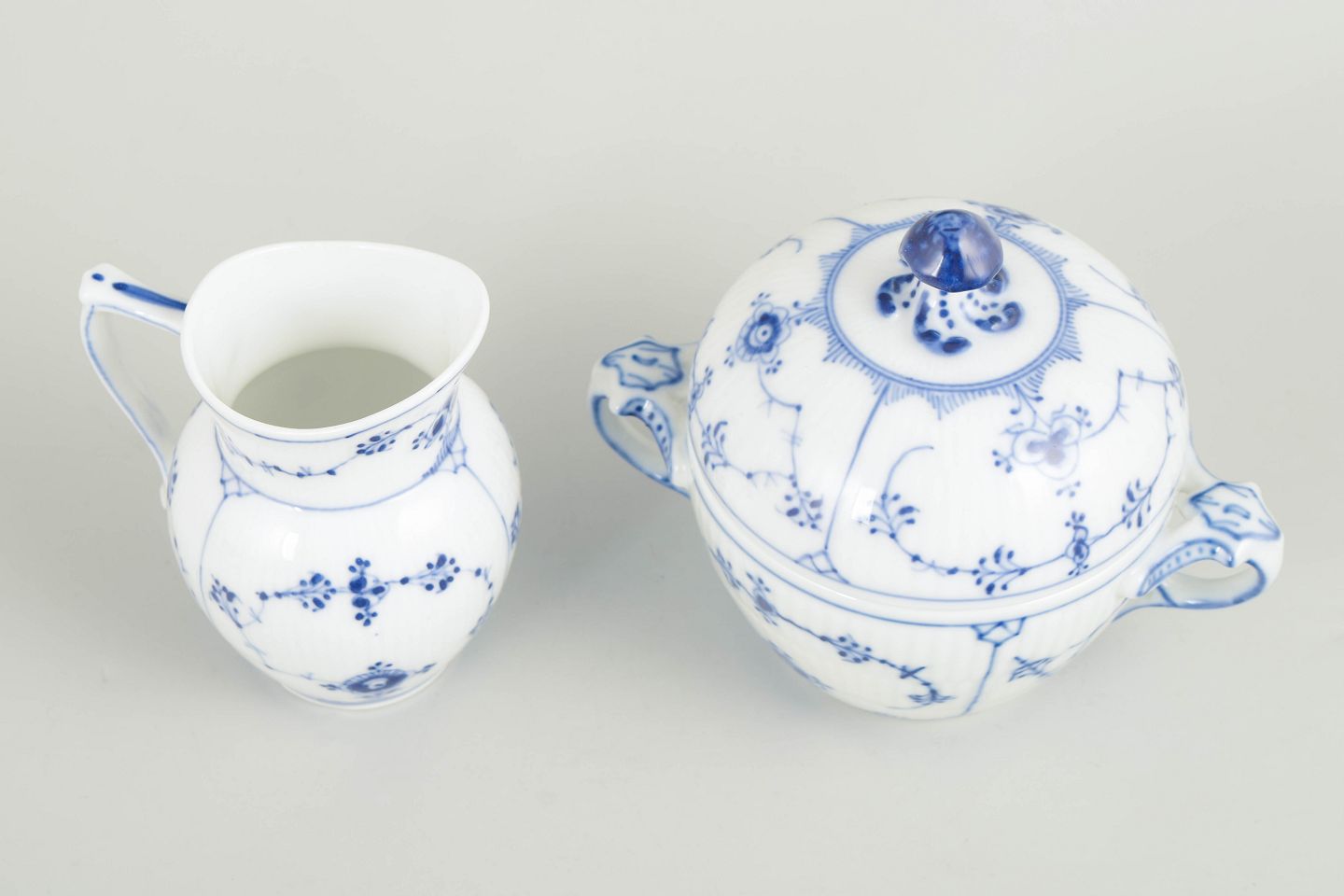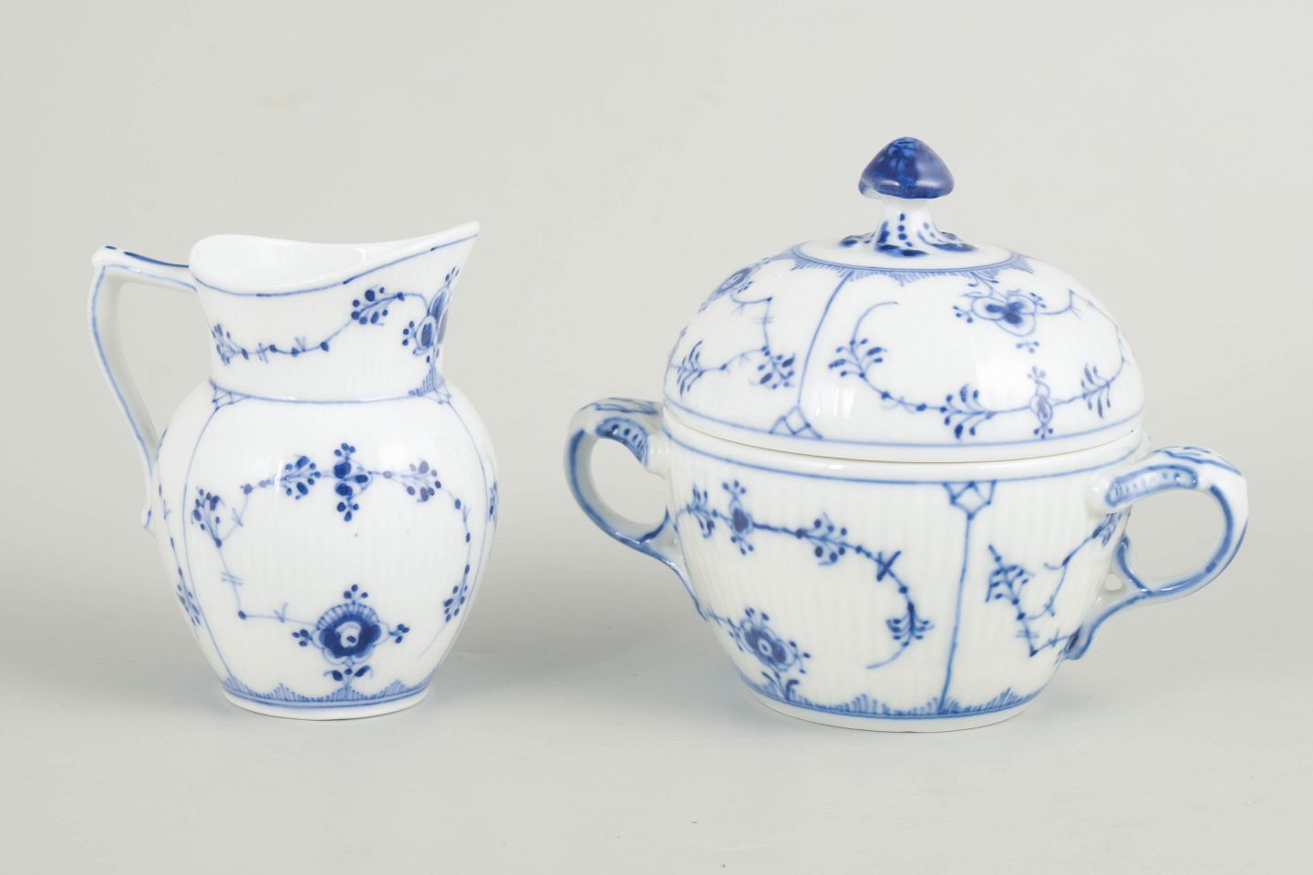 Royal Copenhagen, Musselmalet riflet flødekande og sukkerskål.