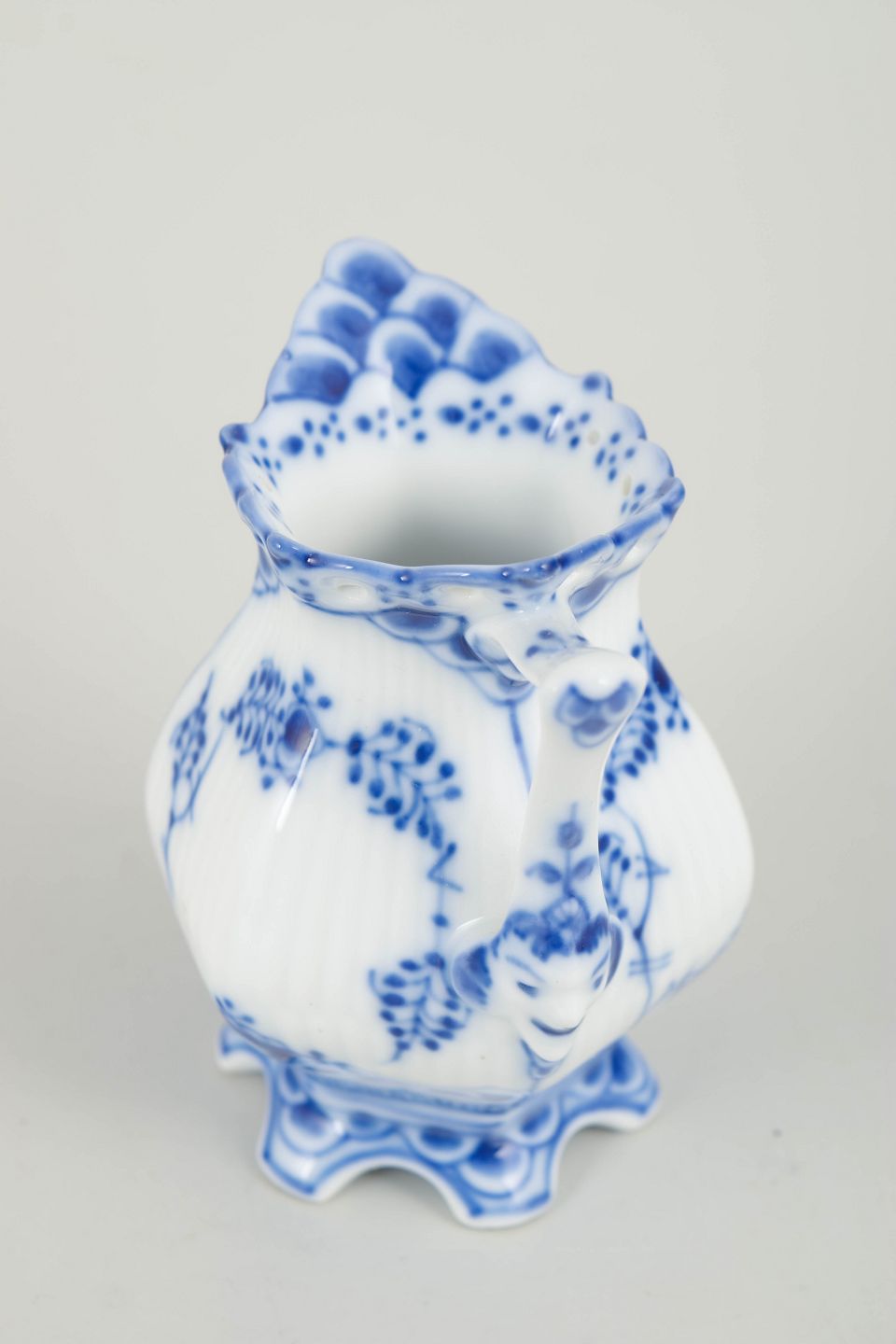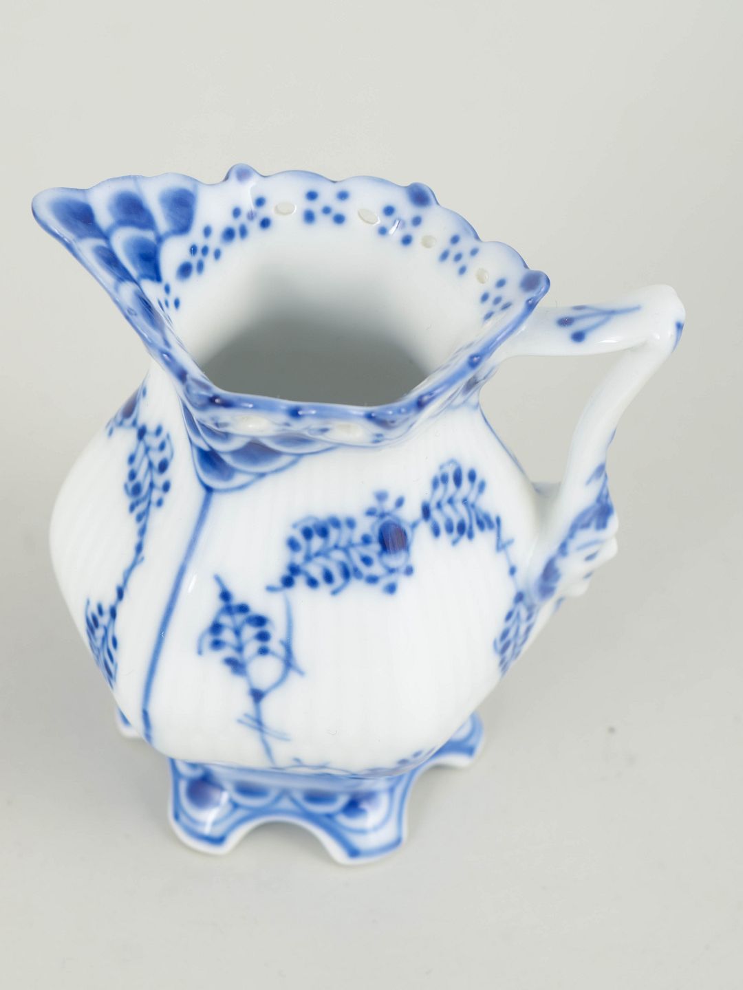 Flødekande i håndmalet underglasurblå dekoration i det klassiske Musselmalet helblonde-stel, med gennembrudt blondedekoration langs kant og fod. Model 1/1031, 1. sortering.