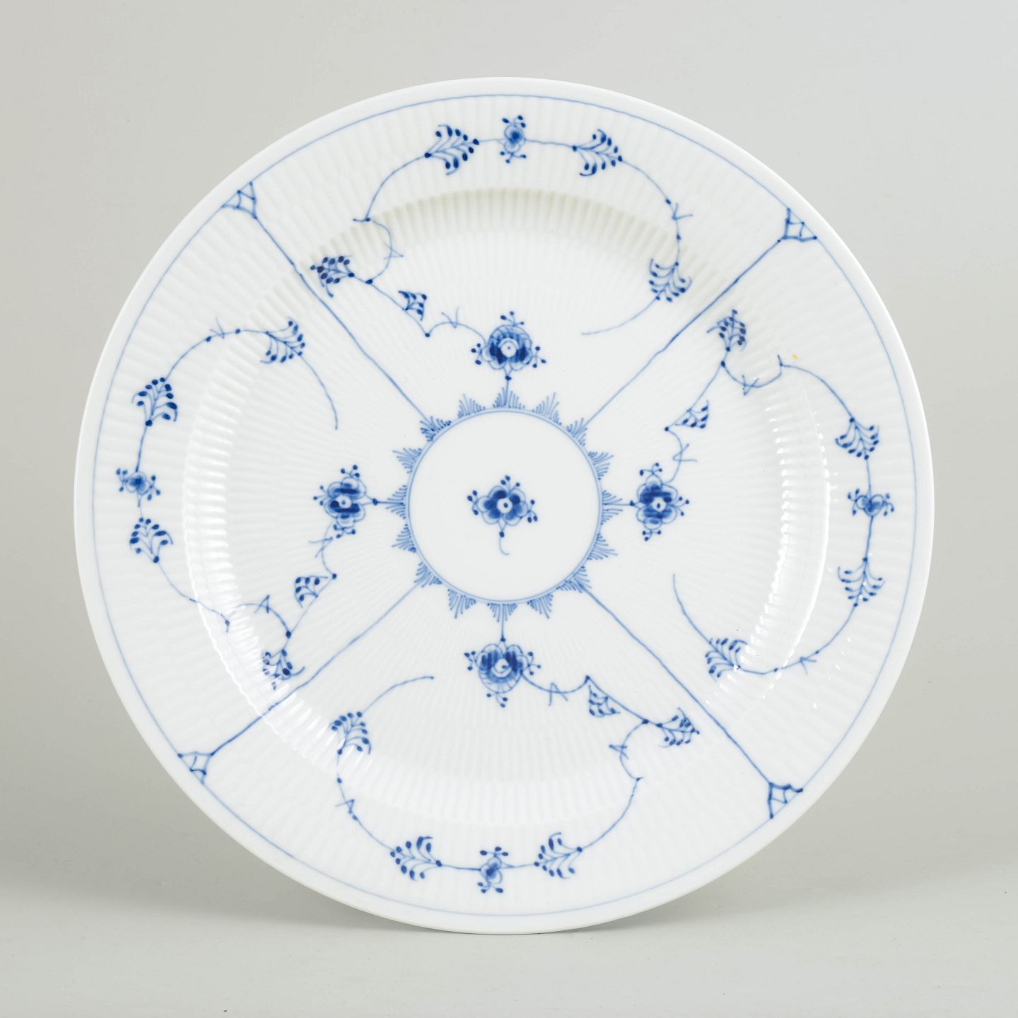 Rundt serveringsfad i porcelæn dekoreret i underglasurblåt med det klassiske Musselmalet Riflet-mønster. Model 1/107.