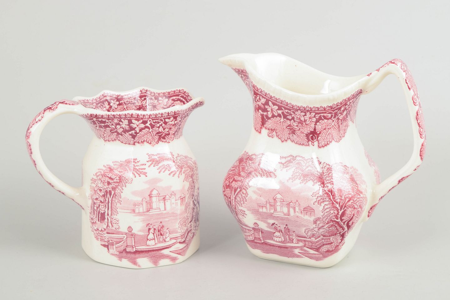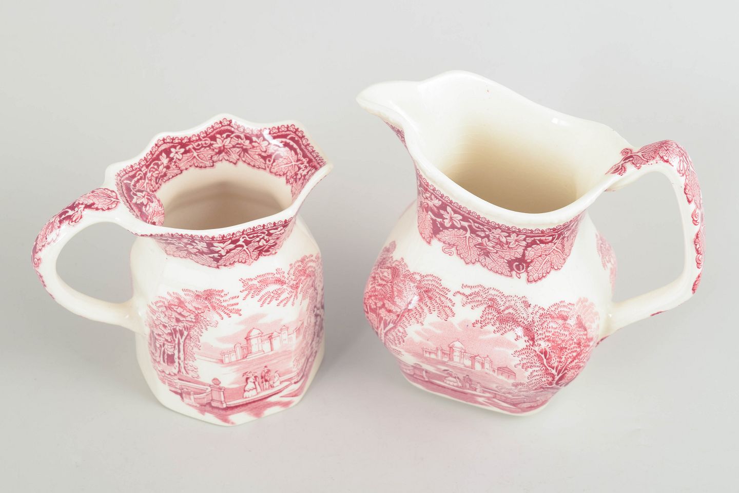 Kander i fajance fra Mason’s, dekoreret i rød transferware med landskabs- og arkitekturmotiver.