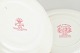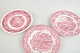 Middagstallerkener i fajance fra engelske producenter, dekoreret i rød transferware med landskabs- og ornamentmotiver.