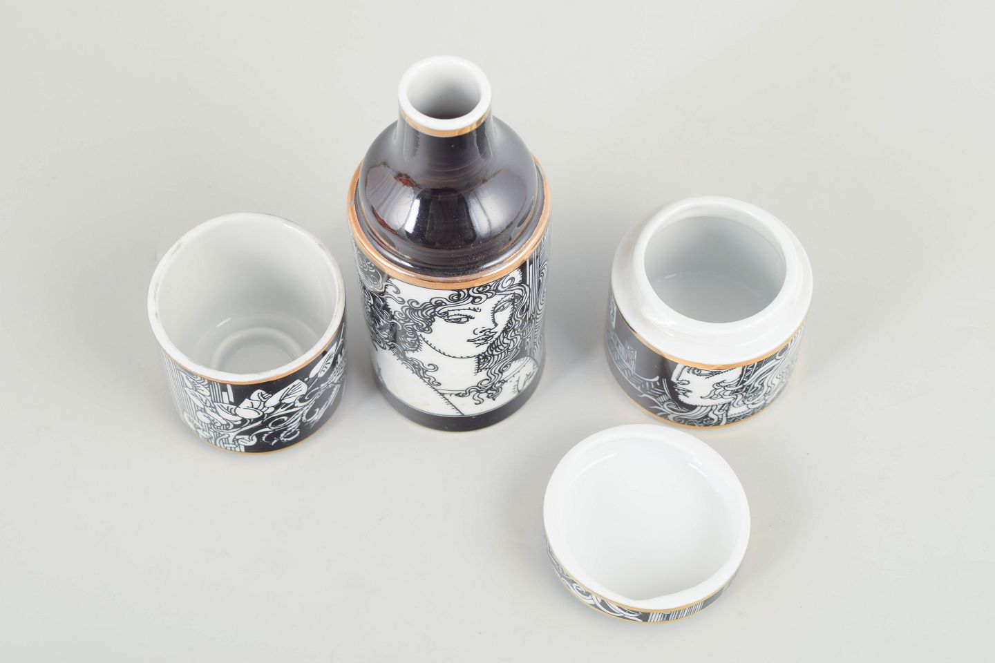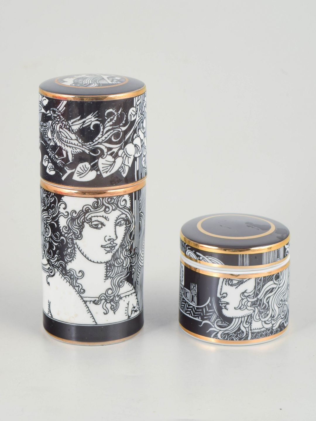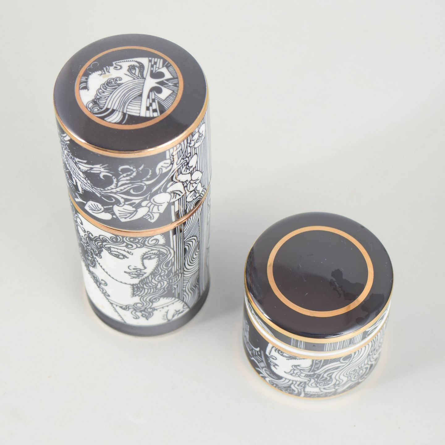 Two cylindrical porcelain lidded jars with black and white graphic decoration and gilt details. Produced as a limited edition.