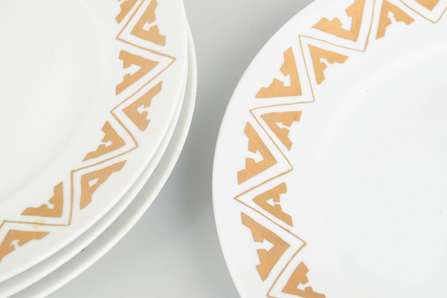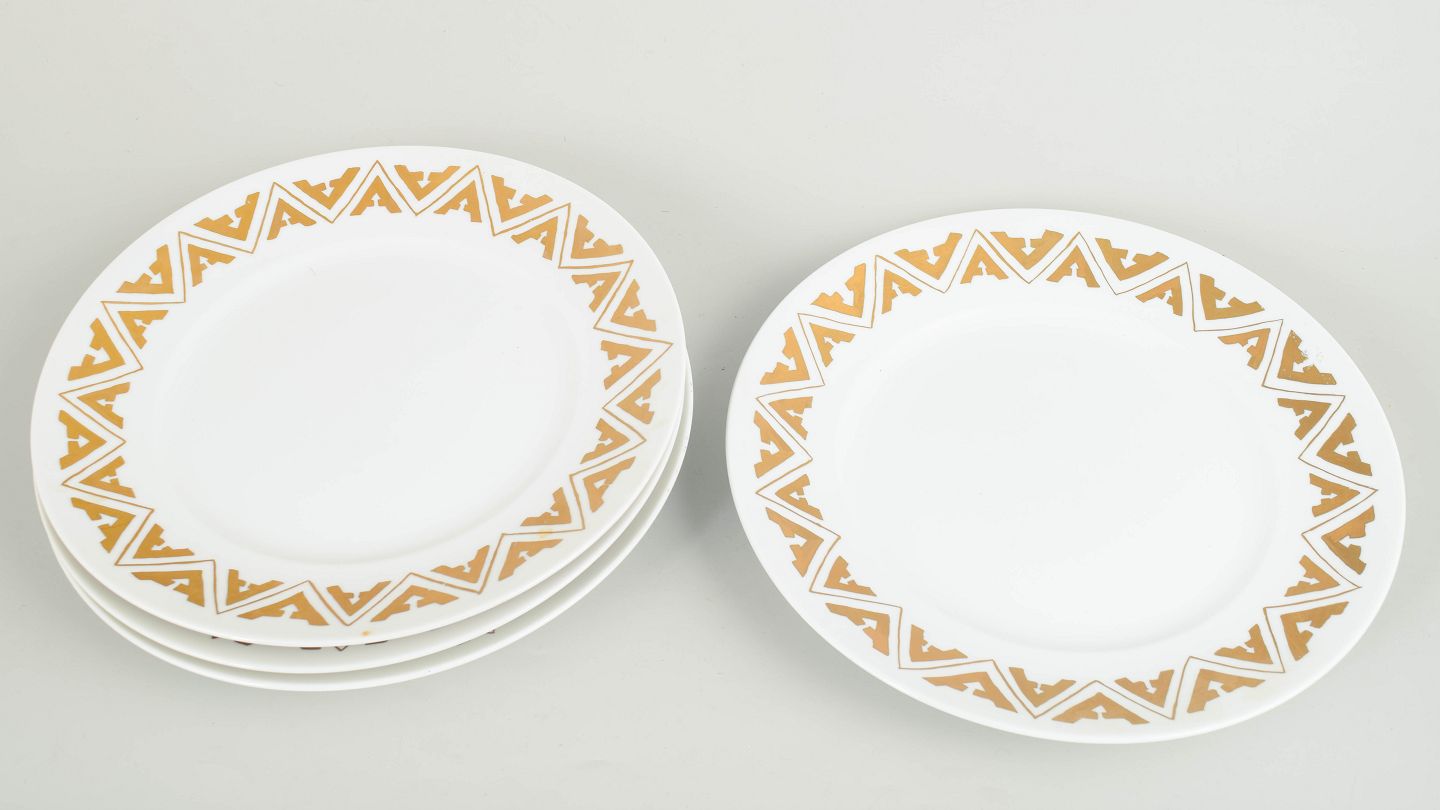 Sæt af fire store middagstallerkener i porcelæn med geometrisk dekoration i Art Deco stil langs fanen. Annulleret med to indridsede streger under bunden. Fremstillet i 1959.