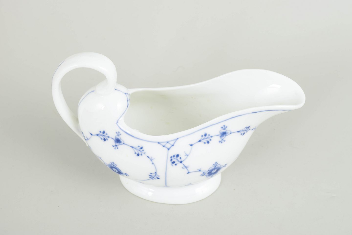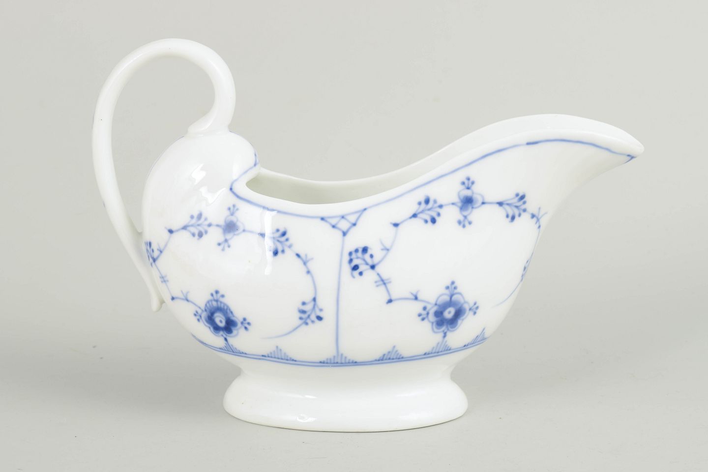 Sauceskål i håndmalet porcelæn fra Musselmalet Riflet med klassisk underglasurdekoration i koboltblå. Model 1/407. Første sortering. Fremstillet i 1920’erne. Mindre afslag ved foden, se foto.
