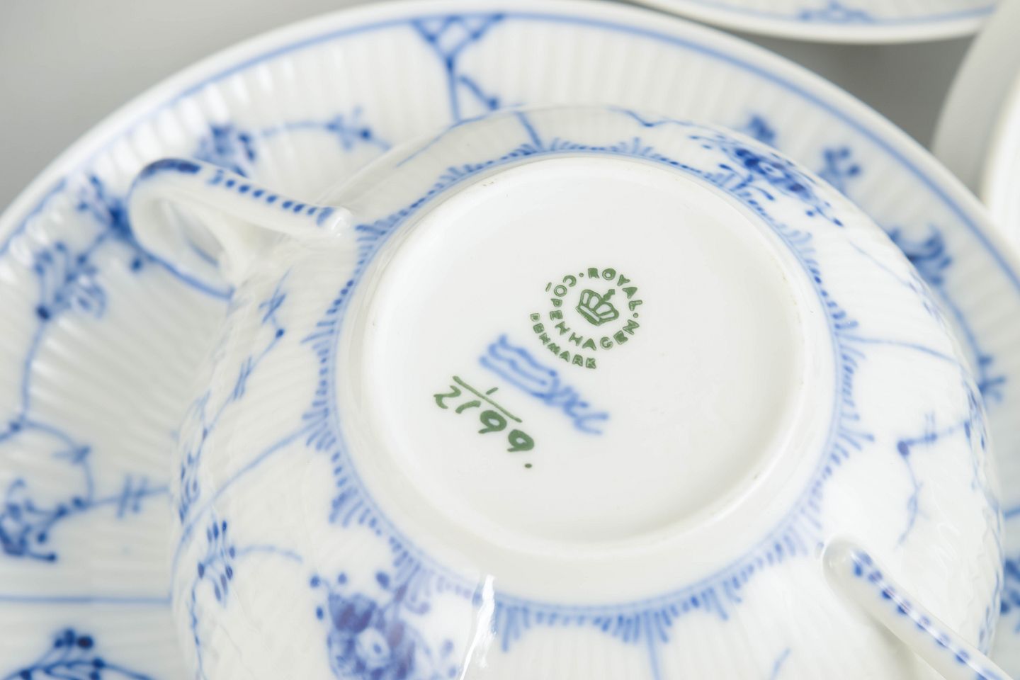 Royal Copenhagen blev grundlagt i 1775 i København under kongelig bevilling. Fabrikken er internationalt anerkendt for sit håndmalede porcelæn og sit høje kunstneriske niveau. Musselmalet Riflet er fabrikkens ældste stel, introduceret i 1775 og stadig produceret i dag, kendt for sin klassiske koboltblå dekoration og riflede form.