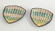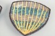 To mindre ovale keramikfade model 2548, udført i stentøj med reliefdekoration og flerfarvet glasur i blå og gule nuancer.