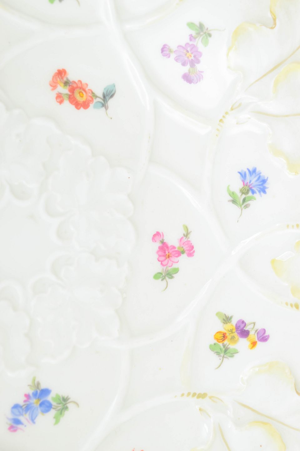 Large circular porcelain dish with relief decoration and hand-painted flowers in polychrome colours and a gilded rim. Marked with Meissen crossed swords and first factory quality.