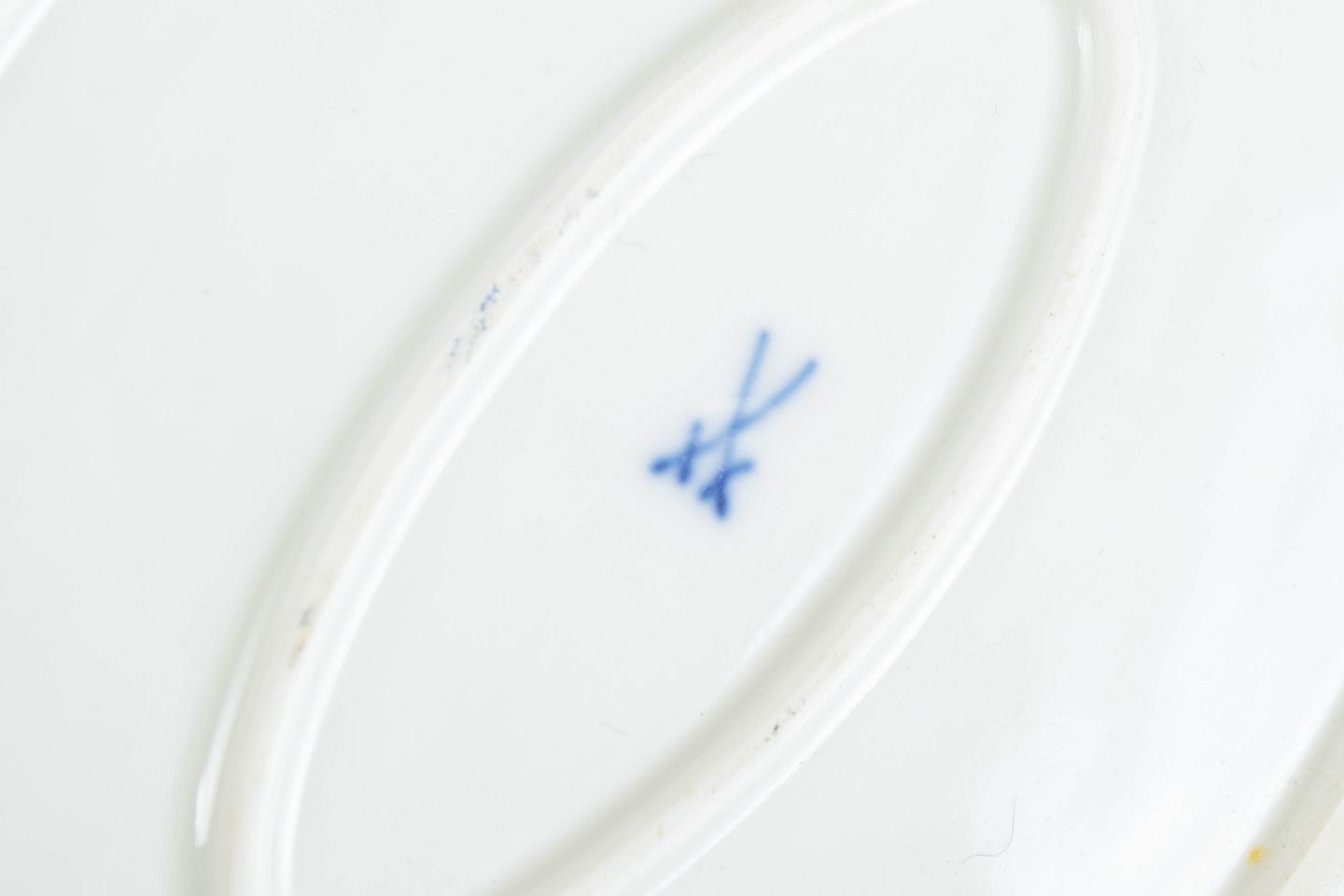 Ovalt serveringsfad i håndmalet porcelæn med Blå Orkidé dekoration. Fremstillet hos Meissen og mærket med Meissens krydssværd. Annulleret med to indridsede streger under bunden.