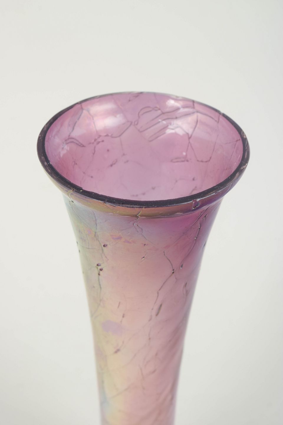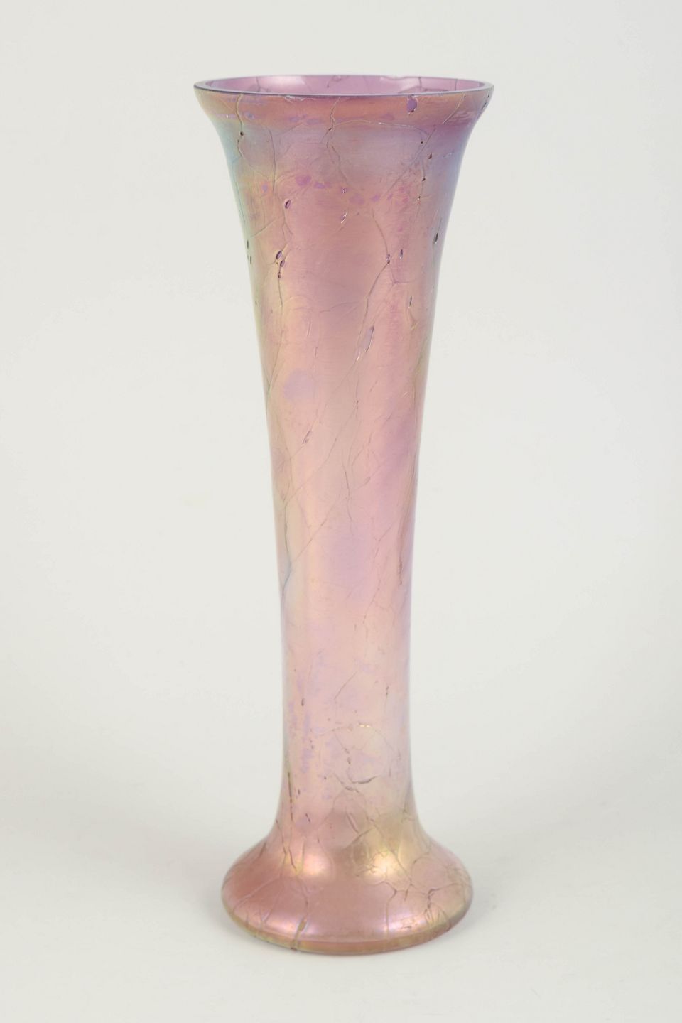 Høj, slank vase i mundblæst glas med iriserende overflade i rosa og gyldne nuancer. Den elegante trompetform og den fine, metalliske glans er karakteristisk for Loetz’ produktion i mellemkrigstiden og afspejler arbejdet med iriserede dekorationer efter art nouveau-periodens højdepunkt.